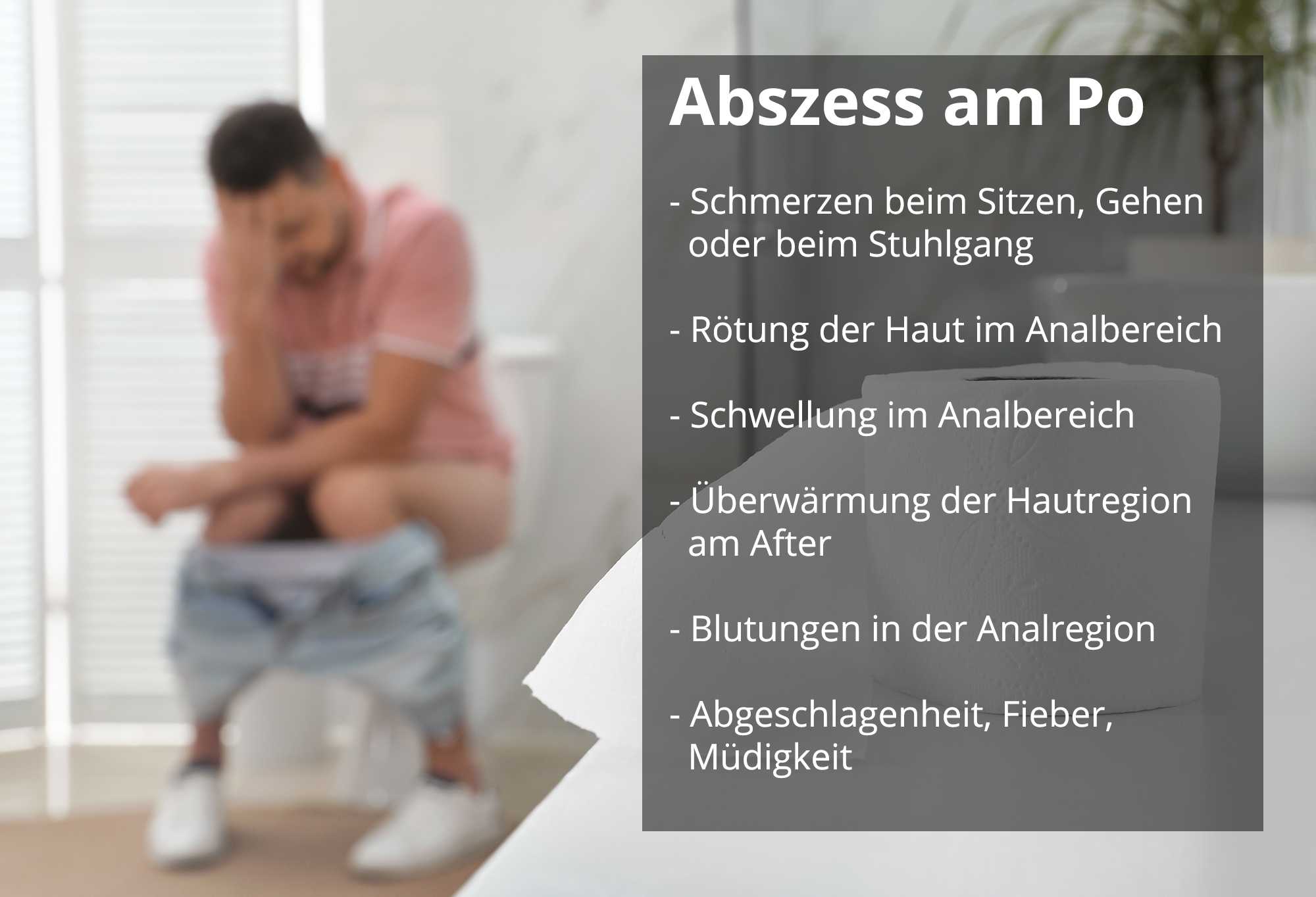Analabszesse, wie Abszesse im Po in der Fachsprache heißen, kommen relativ häufig vor. Hautabszesse an der Pobacke können ebenso auftreten. Ein Abszess ist ein abgekapselter Hohlraum, der mit Eiter gefüllt ist. Bei ungefähr der Hälfte der Analabszesse bilden sich eine oder mehrere Fisteln aus. Fisteln sind Verbindungsgänge, beispielsweise zwischen einem Abszess und der Hautoberfläche. Abszesse in der Analregion verursachen meist Schmerzen beim Sitzen und Gehen. Die Therapie der Wahl ist das chirurgische Öffnen des Abszesses. So kann der Eiter abfließen, die Schmerzen lassen nach und der Abszess kann abheilen.