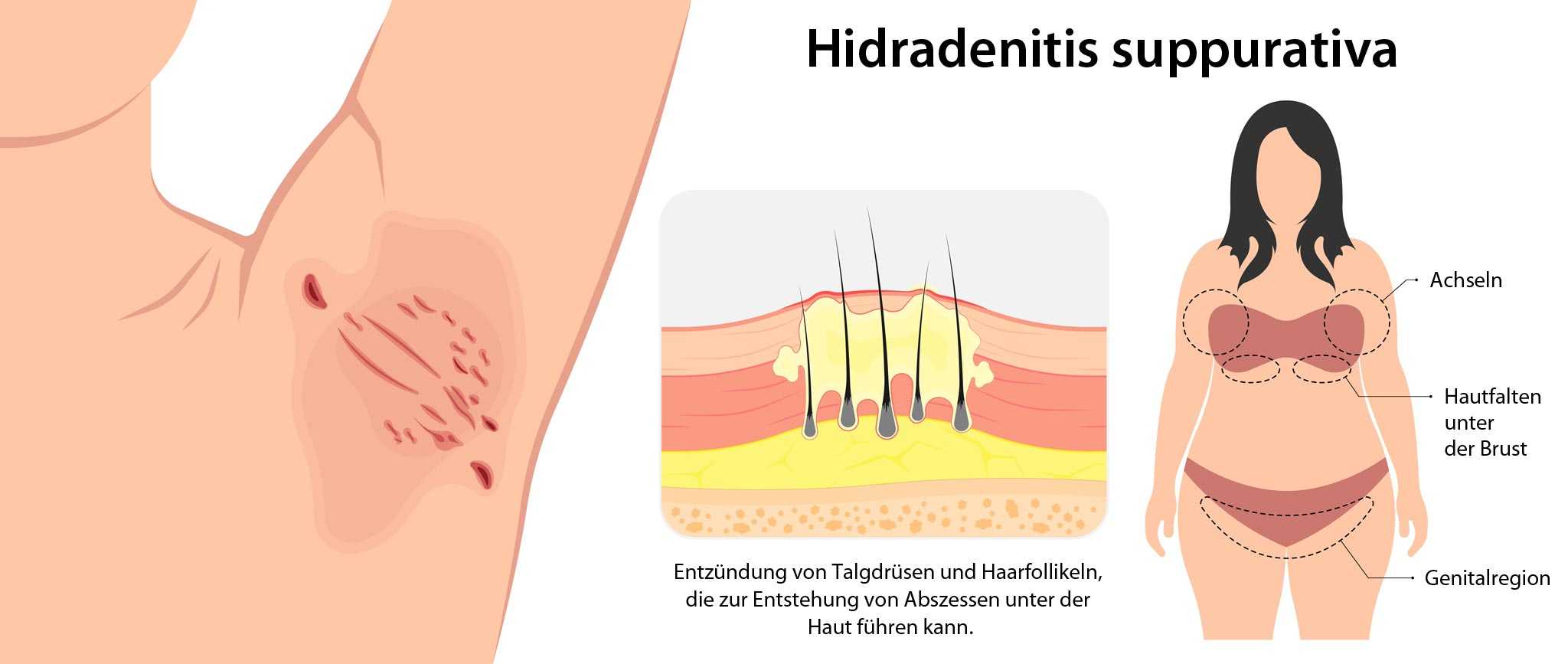 Zu Beginn bilden sich knotenähnliche Entzündungen. Diese entwickeln sich weiter zu Abszessen. Im Laufe der Zeit entstehen zusätzlich Fistelgänge. Die betroffenen Stellen können schmerzen, gerötet und warm sein. Auch die Bewegung der angrenzenden Gelenke, zum Beispiel der Schulter, kann durch die Symptomatik eingeschränkt sein. Häufig sondern die entzündeten Stellen Eiter oder andere Flüssigkeiten ab, die übel riechen können. An diesen Stellen bilden sich dann oft Narben.