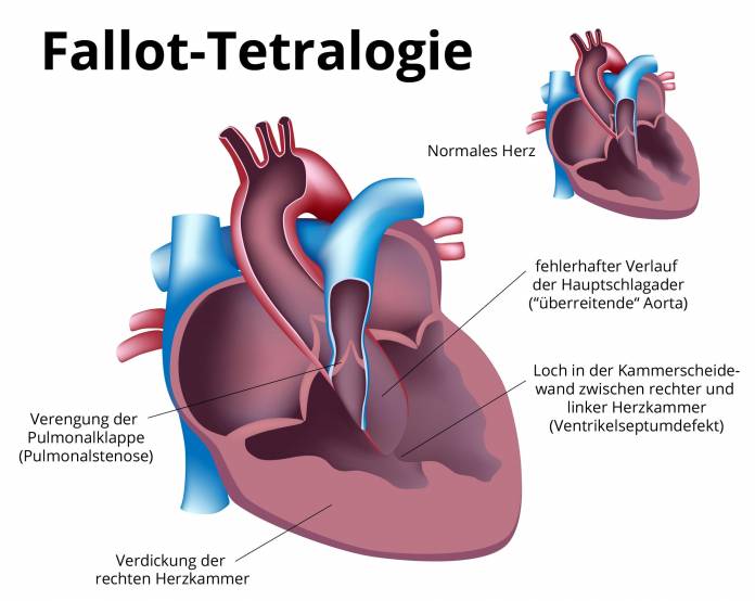 Fallot-Tetralogie (TOF; 5,5 Prozent): Bei der Fallot-Tetralogie besteht eine Kombination aus folgenden vier Fehlbildungen: Pulmonalstenose, Kammerscheidewanddefekt, fehlerhafter Verlauf der Hauptschlagader und Zunahme der Muskeldicke der rechten Herzkammer. Insgesamt kommt es in der Folge zu einem chronischen Sauerstoffmangel aller Organe.