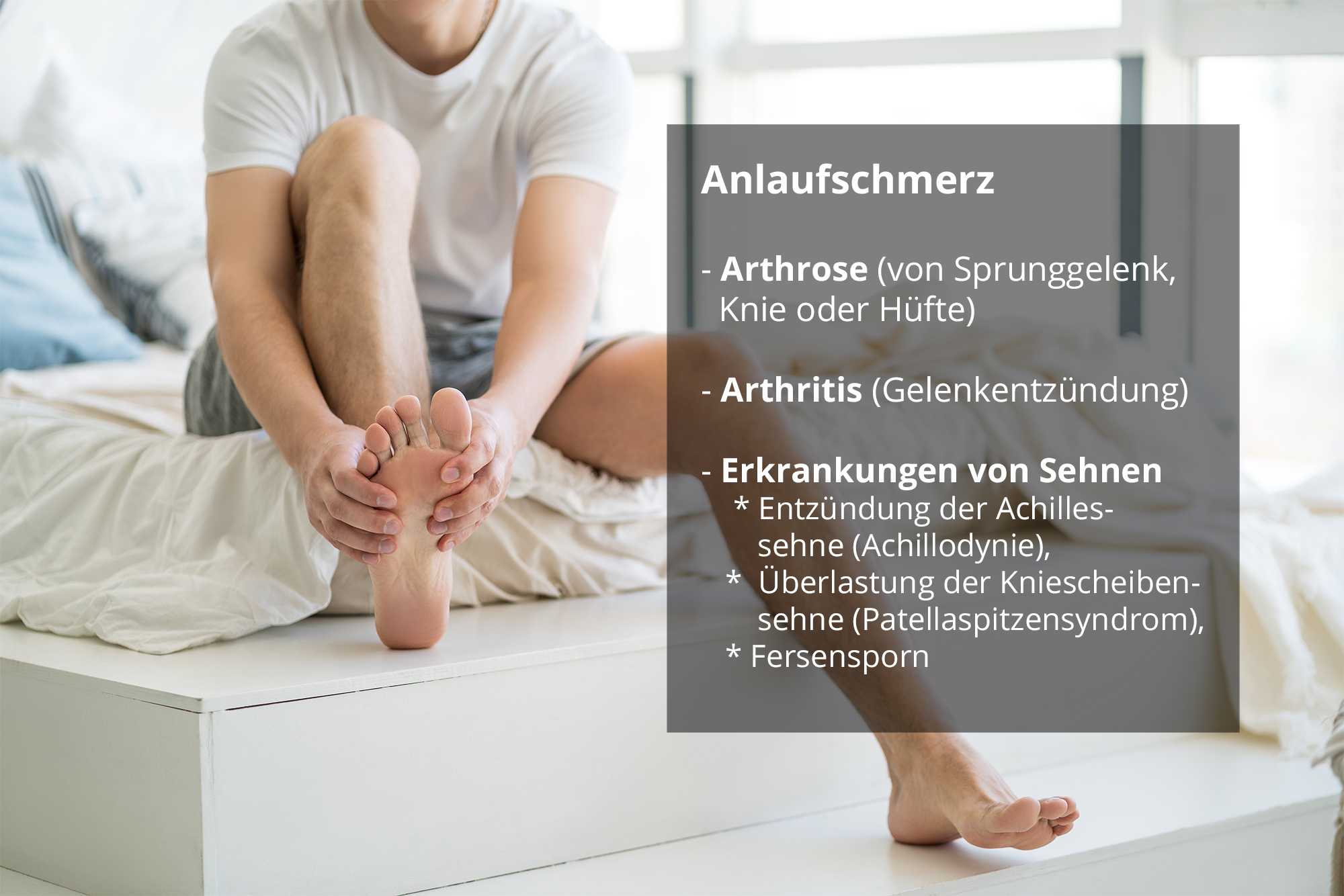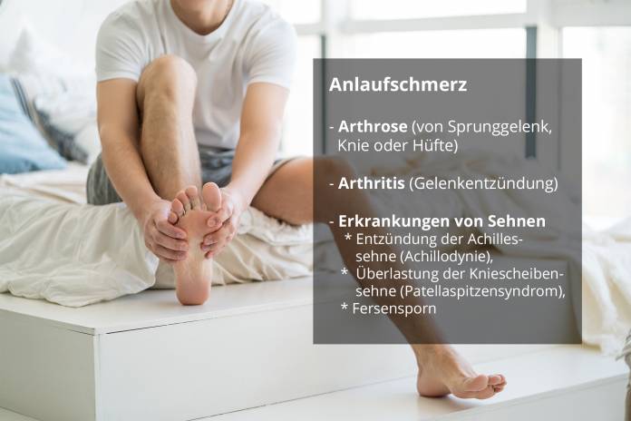 Anlaufschmerzen eines Gelenks können sowohl bei einer Arthrose (Schäden durch Abbau und Abnutzung) als auch bei einer Arthritis (Entzündung unterschiedlicher Ursache) vorkommen. Sie gelten vor allem für die Arthrose als charakteristisches Frühzeichen der Erkrankung. Eine Arthrose ist in der Regel durch kürzer dauernde Anlaufschmerzen gekennzeichnet (wenige Sekunden bis eine Viertelstunde). Eine Arthritis ist dagegen eher mit länger anhaltenden Anlaufschmerzen verbunden (oft über eine halbe Stunde bis einige Stunden). Außerdem ist für eine Arthritis ein Schmerz bei Ruhe typisch, während bei einer Arthrose besonders Belastungsschmerzen auftreten. Anlaufschmerzen an den Sehnen sind üblicherweise durch Entzündungen bedingt.