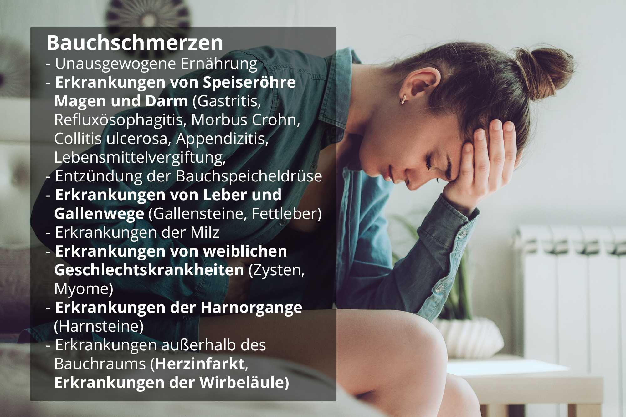 Erkrankungen der Verdauungsorgane können sehr unterschiedliche Schmerzen verursachen, die als stechend oder dumpf im Ober-, Mittel- oder Unterbauch empfunden werden können. Die häufigsten Krankheiten sind:
