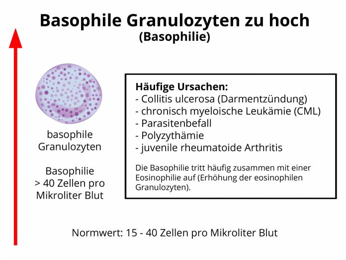 Bei Infektionserkrankungen sind häufig mehrere Leukozyten-Unterarten erhöht. Nur sehr selten kommt es zum alleinigen Anstieg der Basophilen. Eine festgestellte Basophilie kann einen Hinweis auf eine Erkrankung geben.