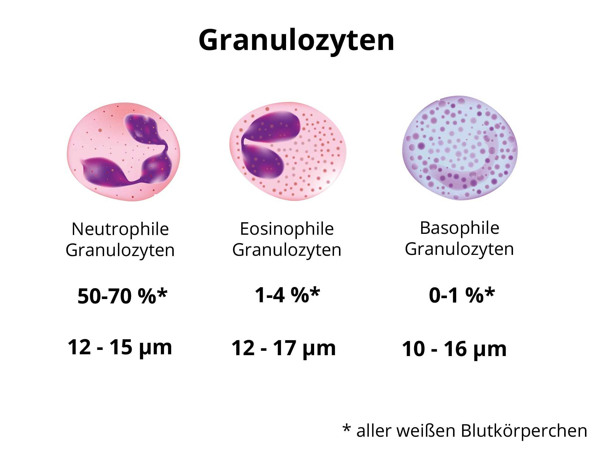 Granulozyten erfüllen als größte Untergruppe der weißen Blutkörperchen wichtige Funktionen in der Immunabwehr. Sie sind von kugelförmiger Gestalt und haben einen Durchmesser von etwa 10 bis 15 μm. Anhand ihres Färbeverhaltens lassen sich unter dem Mikroskop betrachtet drei Untergruppen unterscheiden: