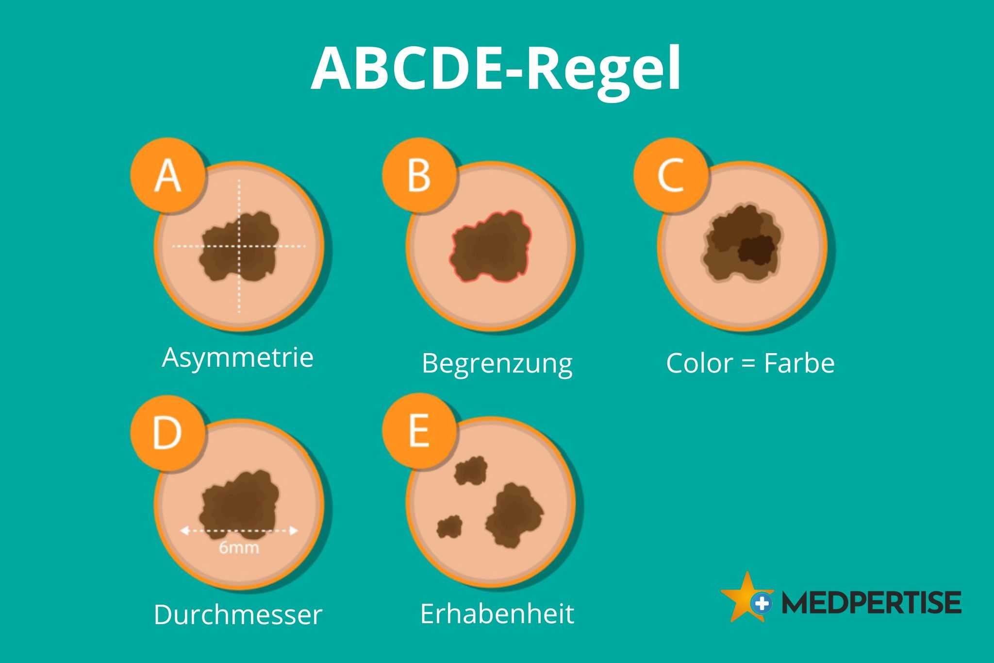 Der Hautarzt schaut bei der Dermatoskopie nach Anzeichen, die auf einen bösartigen Tumor hindeuten. Das übliche Schema zur Abschätzung bei pigmentierten Veränderungen, ob Hautkrebs vorliegen könnte, ist die ABCDE-Regel. Diese beschreibt folgende verdächtige Merkmale: