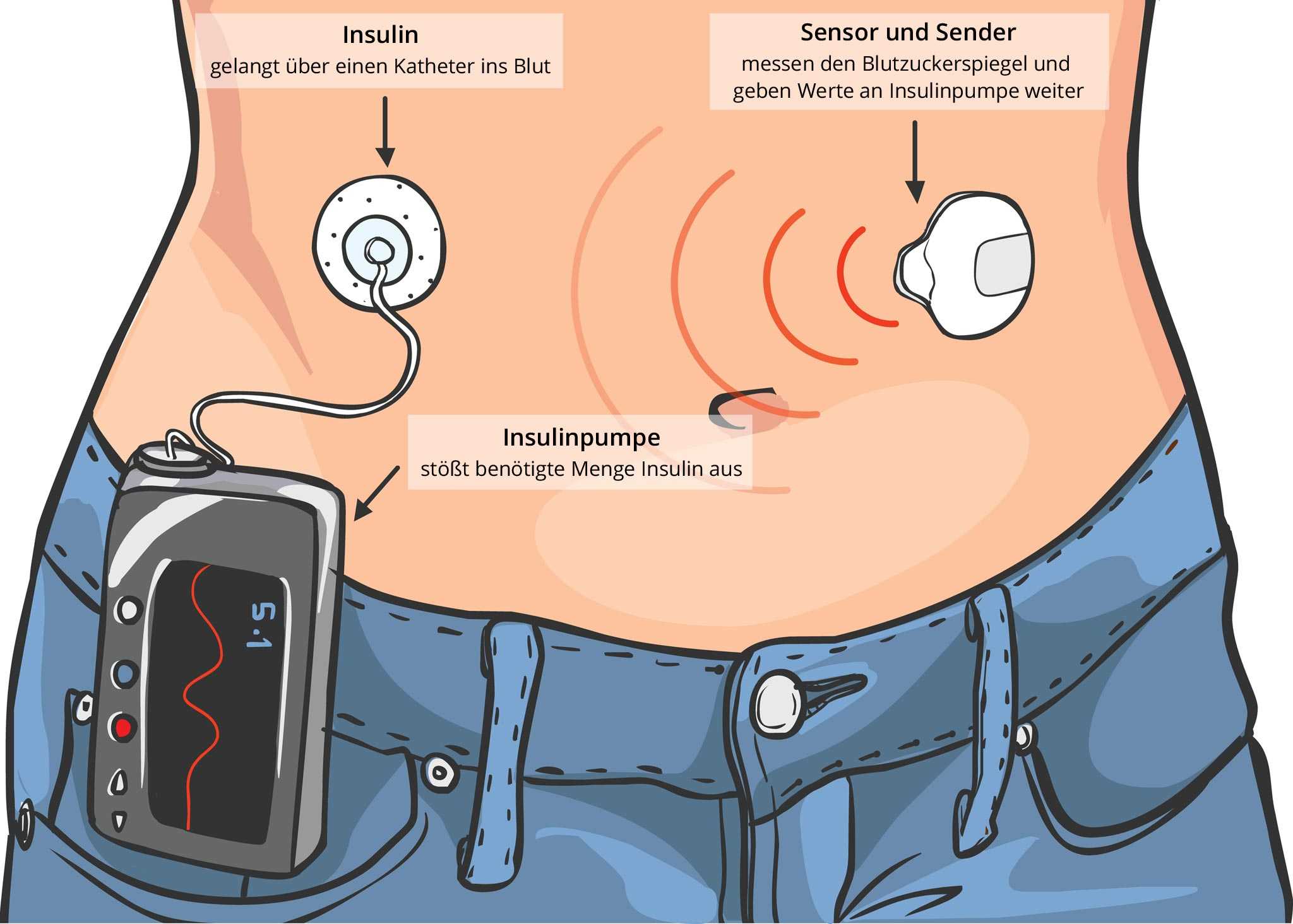 Die künstliche Bauchspeicheldrüse ist eine kleine Apparatur, die an einem Gürtel um den Bauch getragen wird. Sie besteht aus einem Sensor, einem Sender und einer Insulinpumpe. Der Sensor wird direkt auf der Haut aufgebracht und misst permanent den Blutzuckerspiegel des Trägers. Die Werte werden vom Sender an die Pumpe weitergeleitet. Die am Gürtel befestigte Insulinpumpe stößt die benötigte Menge Insulin aus. Über einen Injektionsmechanismus wird dem Träger das Insulin verabreicht. Man spricht von einem sogenannten Closed-Loop-System, da es sich um einen geschlossenen Regelkreis handelt. Bei den derzeit verfügbaren Geräten müssen bestimmte Eingaben gelegentlich noch selbst vorgenommen werden. Sie heißen daher Hybrid-Closed-Loop-Systeme.