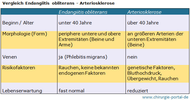 Bei der Endangiitis obliterans, auch als Thrombangiitis obliterans bezeichnet, handelt es sich um eine wiederholt auftretende segmentale Gefäßentzündung (Vaskulitis) kleiner und mittelgroßer Arterien und Venen, überwiegend der unteren Extremität. In der Regel sind die inneren Organe nicht betroffen. Von der Erkrankung sind vor allem junge Männer unter 40 Jahren mit starkem Nikotinkonsum (75 Prozent der Erkrankten) betroffen. Stärkste Prävalenz in Indien, Korea und Japan. In Westeuropa mit Ausnahme des Mittelmeerraumes kommt sie eher selten vor. Normalerweise ist die Lebenserwartung nicht vermindert.