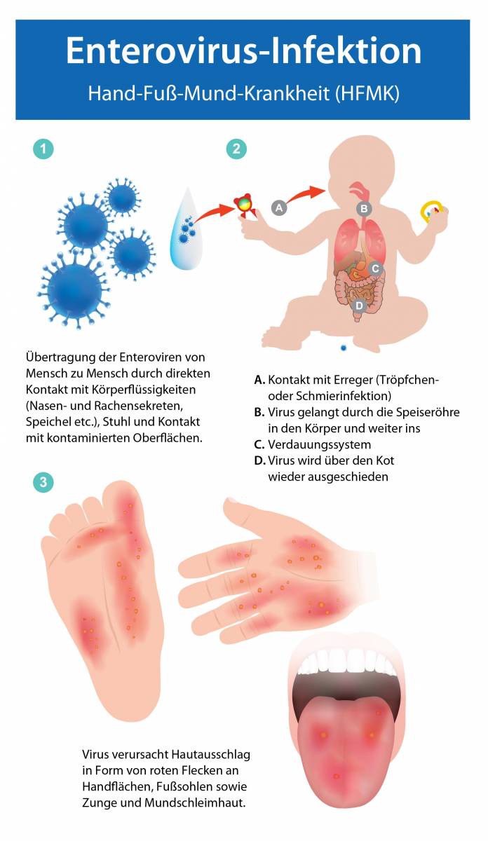 Die Inkubationszeit (Zeit zwischen Infektion und Ausbruch der Krankheit) beträgt zwei bis 35 Tage. Die durch Enteroviren verursachten Krankheitsbilder sind sehr vielschichtig. Sie reichen von