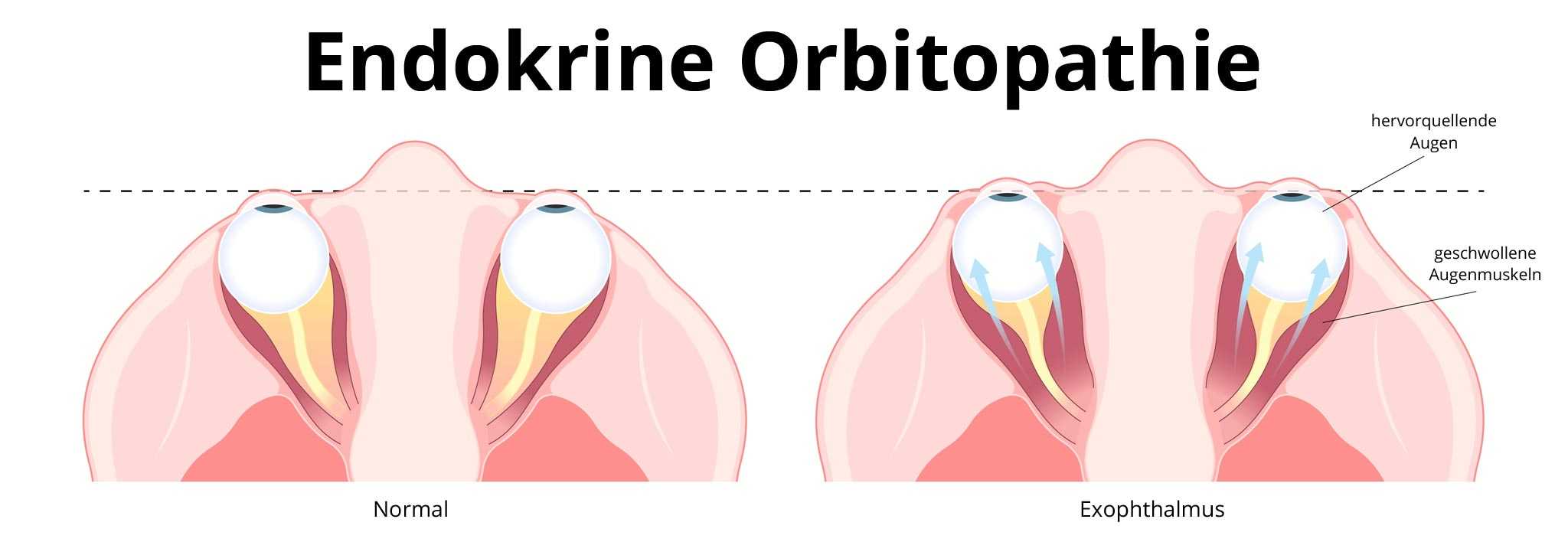 Beide Erkrankungen sind Autoimmunkrankheiten, also dadurch bedingt, dass sich das Immunsystem gegen körpereigenes Gewebe richtet. Sowohl Schilddrüsengewebe als auch Gewebe an anderen Stellen des Körpers ist betroffen. Ist die Augenhöhle (Orbita) betroffen, dann wird das von der Medizin als Endokrine Orbitopathie (EO) bezeichnet. Die Reaktion verursacht eine Entzündung innerhalb der Augenhöhle, die zu einer Schwellung führt. Für den Augapfel ist weniger Platz vorhanden als zuvor, so dass er nach vorne hervorquillt.