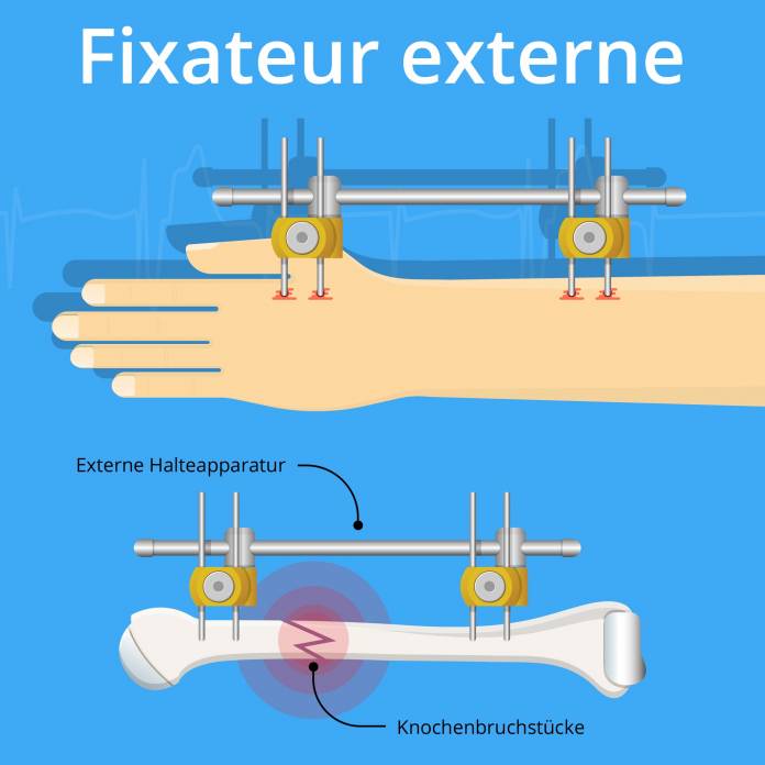 Das oberste Ziel nach einem Knochenbruch ist es, die Funktion des Knochens wieder vollständig herzustellen sowie Schmerzen zu lindern. Hierfür stehen dem Arzt unterschiedliche Methoden zu Auswahl. Eine Möglichkeit ist der Fixateur externe, ein Hilfsmittel, das von außen an den gebrochenen Knochen angebracht wird und ihn stabilisiert.
