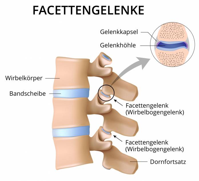 Die Wirbelsäule des Menschen besteht aus 24 Wirbeln (sowie dem Kreuzbein und dem Steißbein). Bis auf die oberen zwei Halswirbel sind alle Wirbel an der Rückenseite der Wirbelsäule durch zwei kleine, paarige Gelenke (Facettengelenke) miteinander verbunden. Diese gewährleisten ein reibungsloses Drehen sowie Vor- und Rückwärtsbewegungen. Ein Geflecht aus Bändern sowie kleinen und großen Muskeln stabilisiert den knöchernen Rückhalt unseres Skelettes.