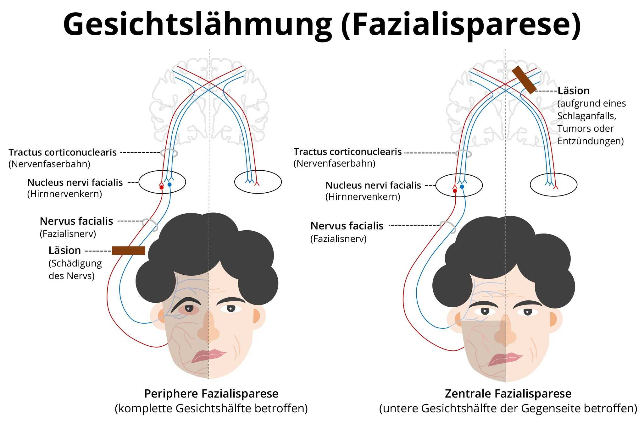 Verschiedene Ursachen kommen in Frage. Wird die Gesichtslähmung beispielsweise durch einen Schlaganfall (Apoplex) ausgelöst, wird auch von einer zentralen (im Gehirn ausgelösten) Fazialisparese gesprochen. Ist der Nerv innerhalb seines Verlaufes geschädigt, spricht man von einer peripheren Fazialisparese. Männer und Frauen sind ähnlich oft von einer Gesichtslähmung betroffen. Sie kann in jedem Alter auftreten.