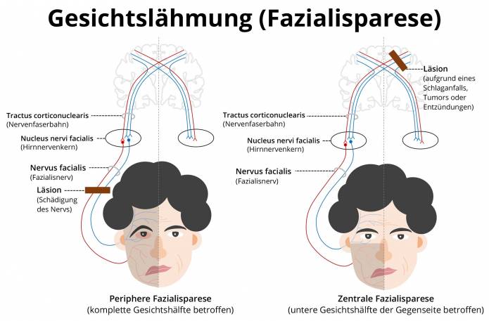 Die Ursachen der peripheren und der zentralen Fazialisparese sind unterschiedlich.
