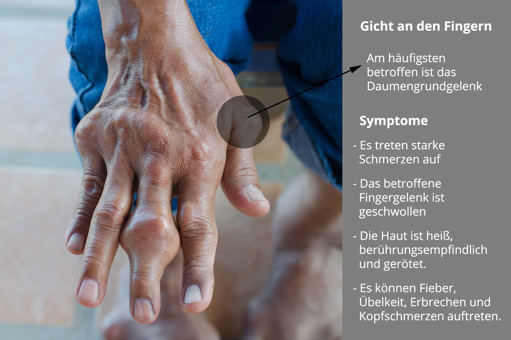 Ein akuter Gichtanfall im Handgelenk oder den Fingergelenken äußert sich in starken Schmerzen. Typischerweise ereignet sich der Gichtschub nachts ohne Vorwarnung, scheinbar aus voller Gesundheit heraus. Das betroffene Hand- oder Fingergelenk ist (häufig stark) geschwollen. Die Haut ist berührungsempfindlich, heiß und gerötet. Die Hand und die Finger sind kraftlos und bewegungseingeschränkt.