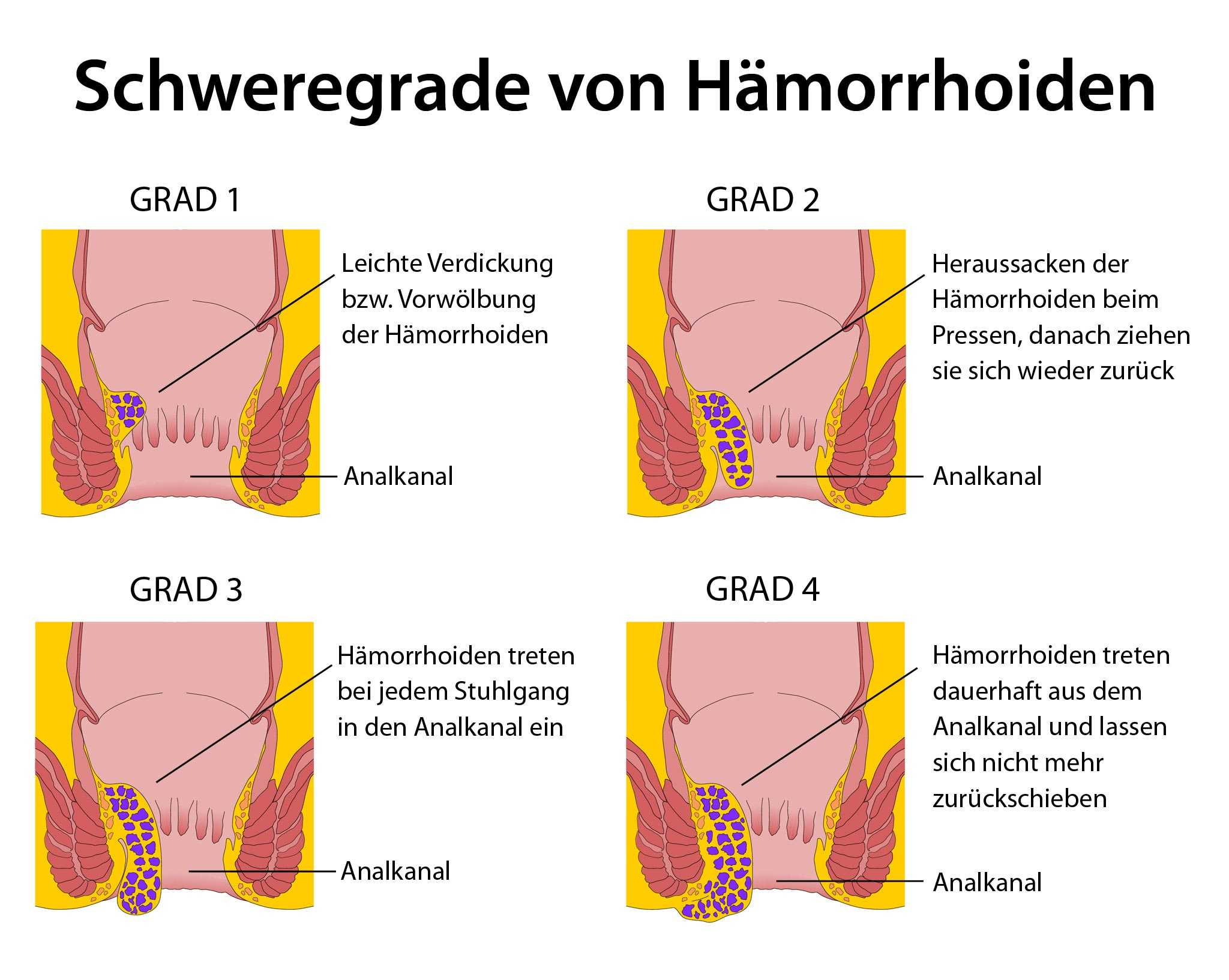 Man unterscheidet vier Schweregrade von vergrößerten Hämorrhoiden, die durch die Ausdehnung definiert werden. Bei Grad 1 besteht lediglich eine leichte Verdickung, bei Grad 2 treten die Hämorrhoiden bei der Bauchpresse aus der Analöffnung heraus (Prolaps), bei Grad 3 besteht der Vorfall bei jedem Stuhlgang und bei Grad 4 lassen sich die vergrößerten Hämorrhoiden nicht mehr zurückschieben.