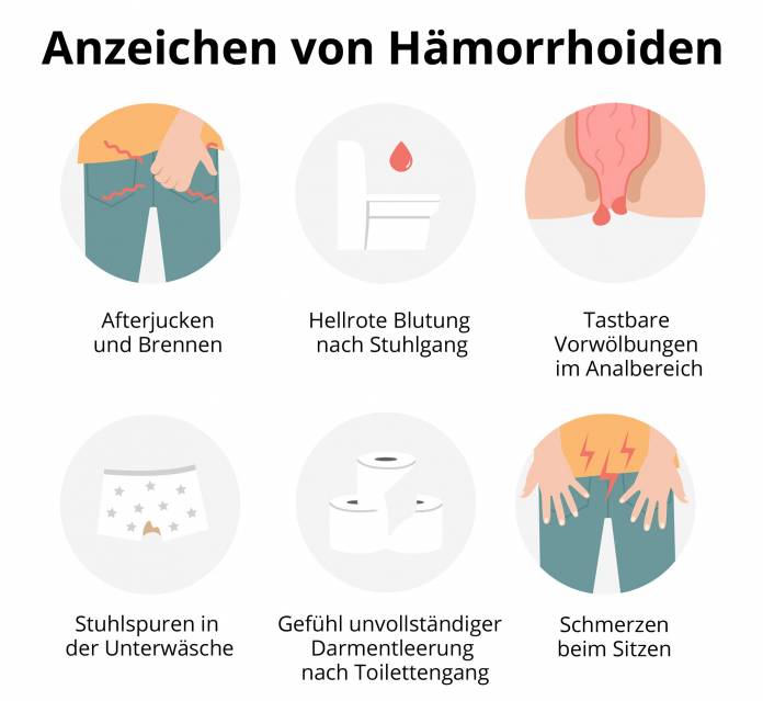 Hämorrhoidalleiden sind weit verbreitet. Die Symptome von Hämorrhoiden variieren je nach Schweregrad der Erkrankung. Zu den wichtigsten Anzeichen, die auftreten können, gehören Juckreiz, hellrotes Blut beim Abwischen, Schmerzen oder (bei stärker ausgeprägten Hämorrhoiden) Gewebe, das aus dem After hervortritt. Fortgeschrittene Hämorrhoiden können zu Komplikationen führen.
