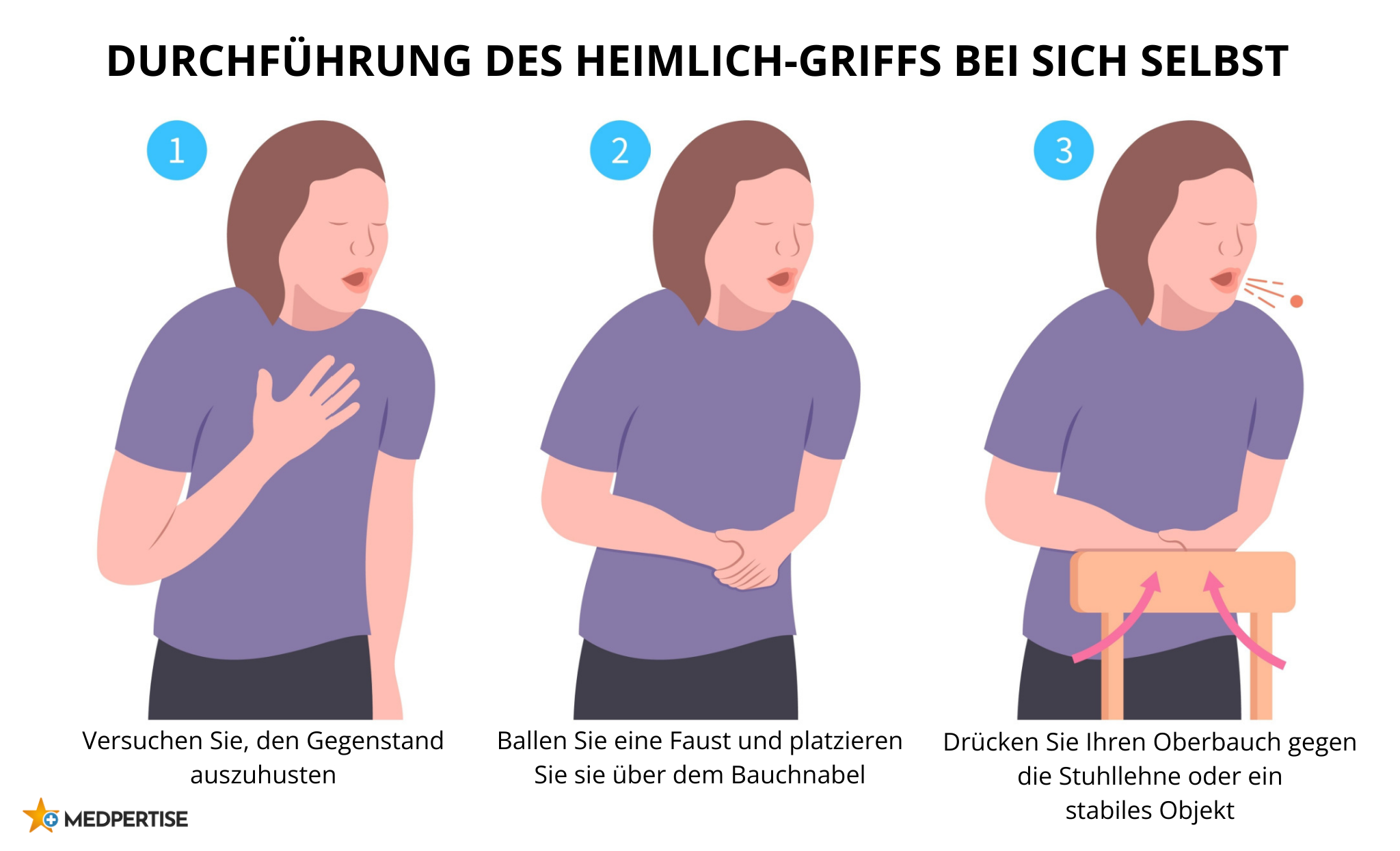 Betroffene können den Heimlich-Griff auch bei sich selbst anwenden, wenn kein Ersthelfer in der Nähe ist. Dazu werden die eigenen Hände, ähnlich wie bei der Durchführung durch eine andere Person, unterhalb des Brustbein-Endes auf den Oberbauch gelegt. Die Hände werden mehrfach so fest wie möglich nach hinten und oben gedrückt. Auch hier sollte der Oberkörper nach vorne geneigt sein.