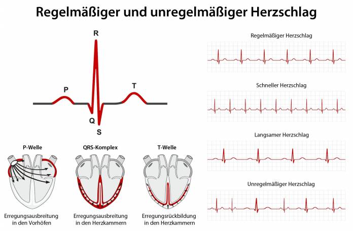 Herzrhythmusstörungen äußern sich entweder in einem zu schnellen (Tachykardie) oder zu langsamen (Bradykardie) Herzschlag. Herzrhythmusstörungen dürfen nicht mit dem natürlich schneller werdenden Herzschlag unter körperlicher Belastung verwechselt werden. Das Ansteigen der Herzschlagfrequenz bei körperlichen Anstrengungen ist ein Normalzustand. Durch die Anstrengung benötigen die Muskeln und Organe im Körper mehr Sauerstoff. Das Herz muss eine größere Menge Blut durch den Körper pumpen. Zeitgleich steigt die Atemfrequenz an, um das Blut mit ausreichend Sauerstoff anzureichern. Der Herzschlag verlangsamt sich wieder, kurz nachdem die körperlichen Anstrengungen nachlassen.