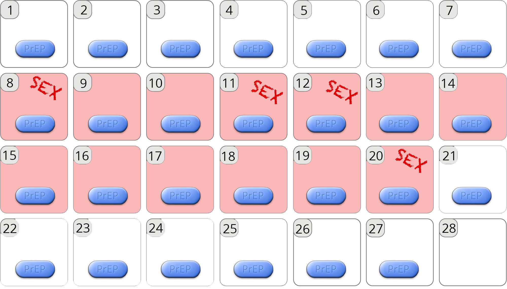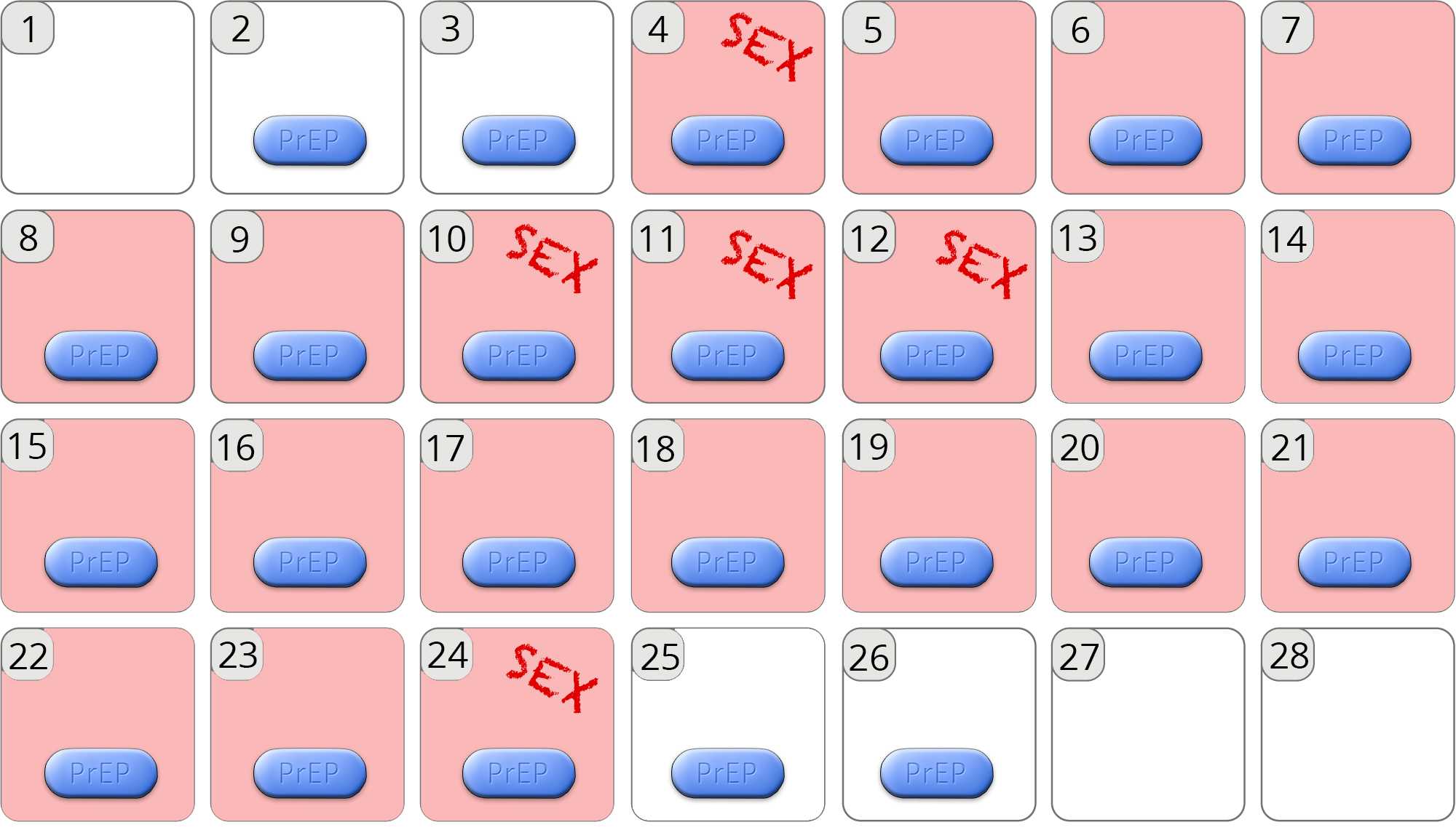 Wer nicht täglich Medikamente einnehmen will, kann auf die anlassbezogenen PrEP zurückgreifen. Am ersten Tag wird die doppelte Dosis eingenommen. Zwei bis 24 Stunden vor dem Sex werden zwei Tabletten eingenommen und danach an zwei nachfolgenden Tagen (24 und 48 Stunden nach der ersten Einnahme) je eine weitere Tablette. Die anlassbezogene PrEP wird nicht empfohlen. Sie scheint etwas weniger sicher zu funktionieren als die tägliche Medikamenteneinnahme.