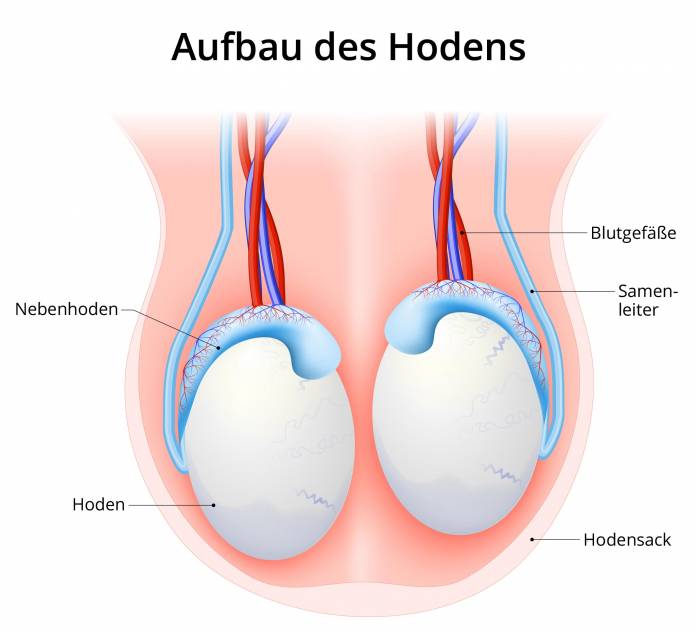 Die beiden Hoden liegen frei hängend an einem Samenstrang im Hodensack. Sie produzieren lebenslang die Samenfäden (Spermien) und die männlichen Geschlechtshormone. Auf der Rückseite liegt der Nebenhoden wie eine Kappe eng am Hoden an. Beim Samenerguss gelangen die Spermien vom Hoden in den Nebenhoden. Dort reifen sie heran, werden beweglich und können durch die Samenleiter und die Harnröhre nach außen befördert werden.