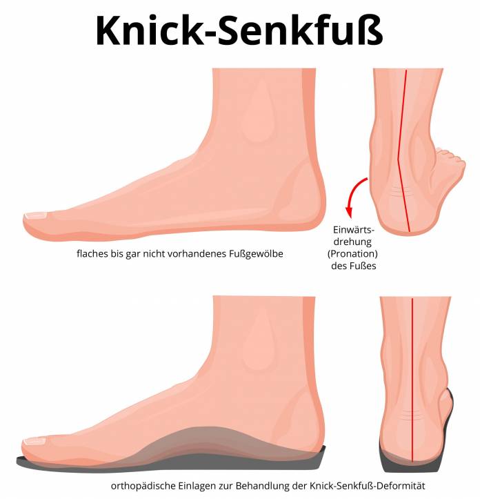 Wichtig für die ärztliche Diagnose ist bereits der Anblick der Füße und Beine. Bei Kindern ist der Knick-Senkfuß zwar optisch auffällig, aber schmerzfrei. Die Kinder belasten eher die Innenseiten der Füße beim Laufen. Typisch ist eine leichte X-Stellung der Beine, da das flachere Fußgewölbe zu einer Veränderung der Beinachse führt.