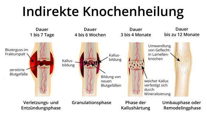 In der Verletzungsphase ereignet sich der Bruch, es bildet sich ein Bluterguss (Hämatom) im Frakturspalt. In der folgenden Entzündungsphase sprossen bindegewebige Zellen in den Spalt und das Hämatom ein. Die anschließende Granulationsphase dauert circa vier bis sechs Wochen. In diesem Zeitraum bildet sich eine Art Ersatzknochen aus, der Kallus. Er wächst von den Fraktur-Enden aus nach innen. In der Phase der Kallushärtung verfestigt sich der zunächst weiche Kallus durch zunehmende Mineralisierung. Die Phase dauert etwa drei bis vier Monate. Nach Abschluss der Härtungsphase kann der Knochen wieder mäßige Belastungen aushalten. Nun folgt die Umbauphase oder Remodelingphase. Hier wird der vorhandene Geflechtknochen (vorläufige Form von Knochengewebe) in Lamellenknochen (strukturiertes, belastbares Knochengewebe) umgebaut. Diese Phase kann unterschiedlich lange dauern. Nach zwölf Monaten sollte sie abgeschlossen sein.