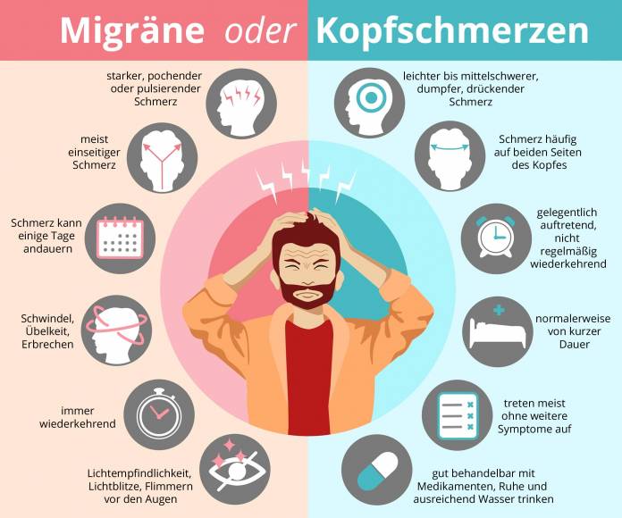 Bei Migräne ist der Kopfschmerz in zwei Drittel der Fälle einseitig. Migräneschmerzen werden als pochend oder pulsierend beschrieben, als Gewitter oder Presslufthammer im Kopf. Migräne ist häufig schmerzhafter als Spannungskopfschmerz, die Intensität reicht von mittelstark bis sehr stark.