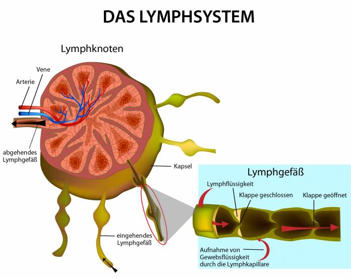 Das Lymphsystem setzt sich aus verschiedenen Organen, Lymphgefäßen, lymphatischen Zellen und Lymphknoten zusammen. Es ist Teil des Immunsystems und schützt den Körper vor Krankheitserregern. Hauptaufgabe ist der Abtransport von Stoffwechselprodukten, Bakterien, Fetten und Proteinen mit der Lymphe, einer weißlichen Flüssigkeit, die durch die Lymphgefäße fließt. In den Lymphknoten werden diese Stoffe aus der Lymphe gefiltert und unschädlich gemacht. Die Lymphgefäße münden letztendlich in den Blutkreislauf.
