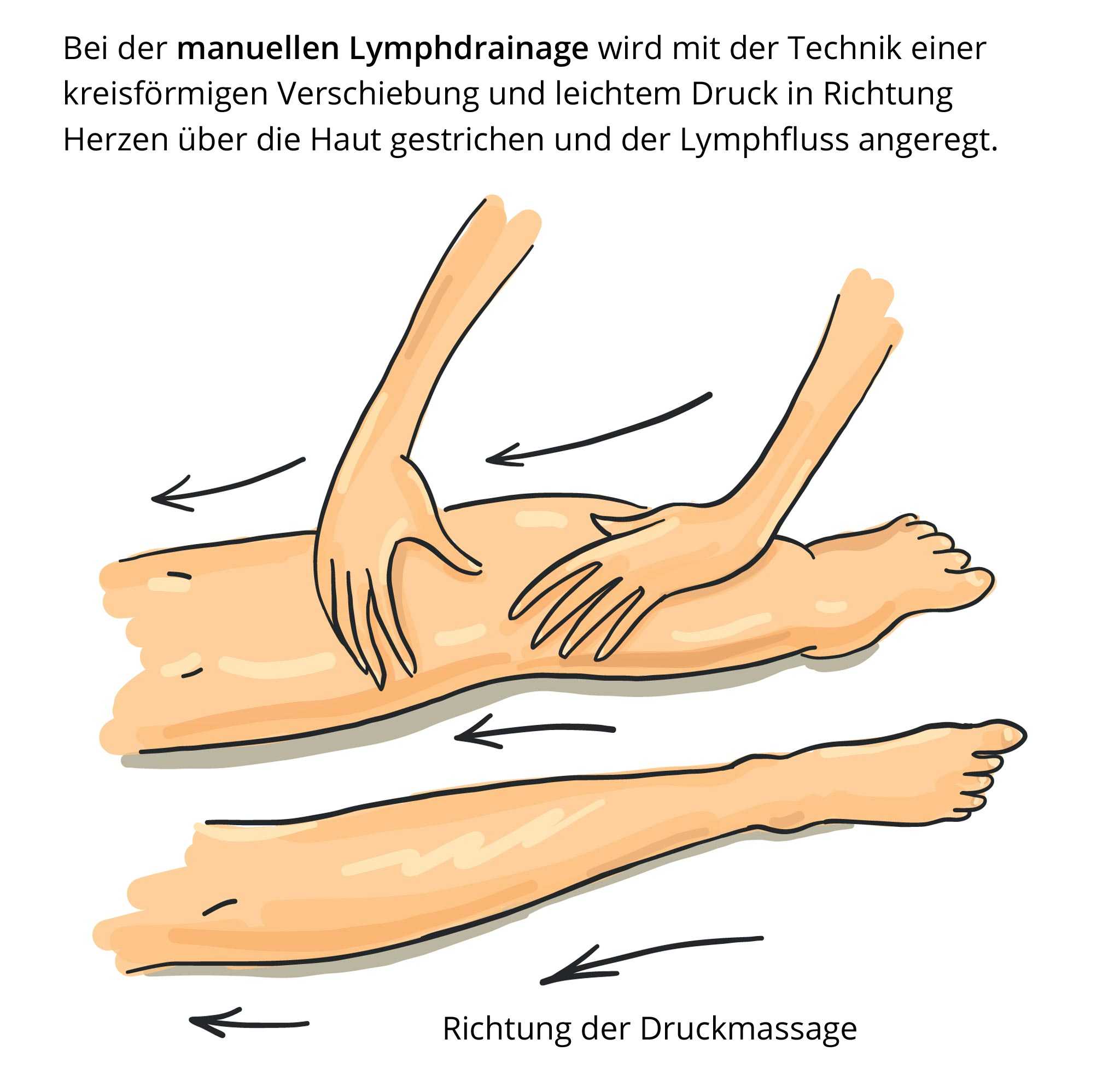 Am einfachsten kann man sich eine Lymphdrainage wie eine Massage vorstellen. Der Unterschied zur klassischen Massage ist, dass keine gesteigerte Durchblutung der behandelnden Körperregion erzielt werden soll. Die Lymphdrainage soll sich ausschließlich auf Haut- und Unterhautbereich auswirken. Mit der Technik einer kreisförmigen Verschiebung wird die Flüssigkeit aus dem Gewebe in das Lymphgefäßsystem verschoben. Die Schwellung geht zurück und die Schmerzen werden gelindert.