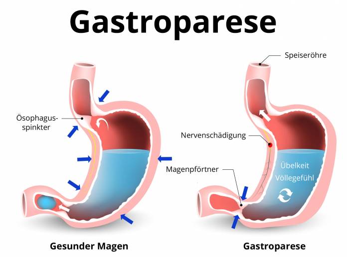 Bei einer Magenlähmung ist die Eigenbewegung (Peristaltik) des Magens und der Magenmuskulatur eingeschränkt oder sie fällt ganz aus. Die Folge ist eine Magenentleerungsstörung. Der Speisebrei wird verlangsamt in den Dünndarm weitertransportiert. Die Ursache der Magenlähmung (Gastroparese) sind meist Nervenschädigungen, zum Beispiel als Folge einer Zuckerkrankheit (Diabetes mellitus). Die Betroffenen klagen über Völlegefühl, Übelkeit, Erbrechen oder Gewichtsverlust. Eine Behandlung kann mit einer Ernährungsumstellung, medikamentös oder mit Hilfe eines Magenschrittmachers erfolgen.