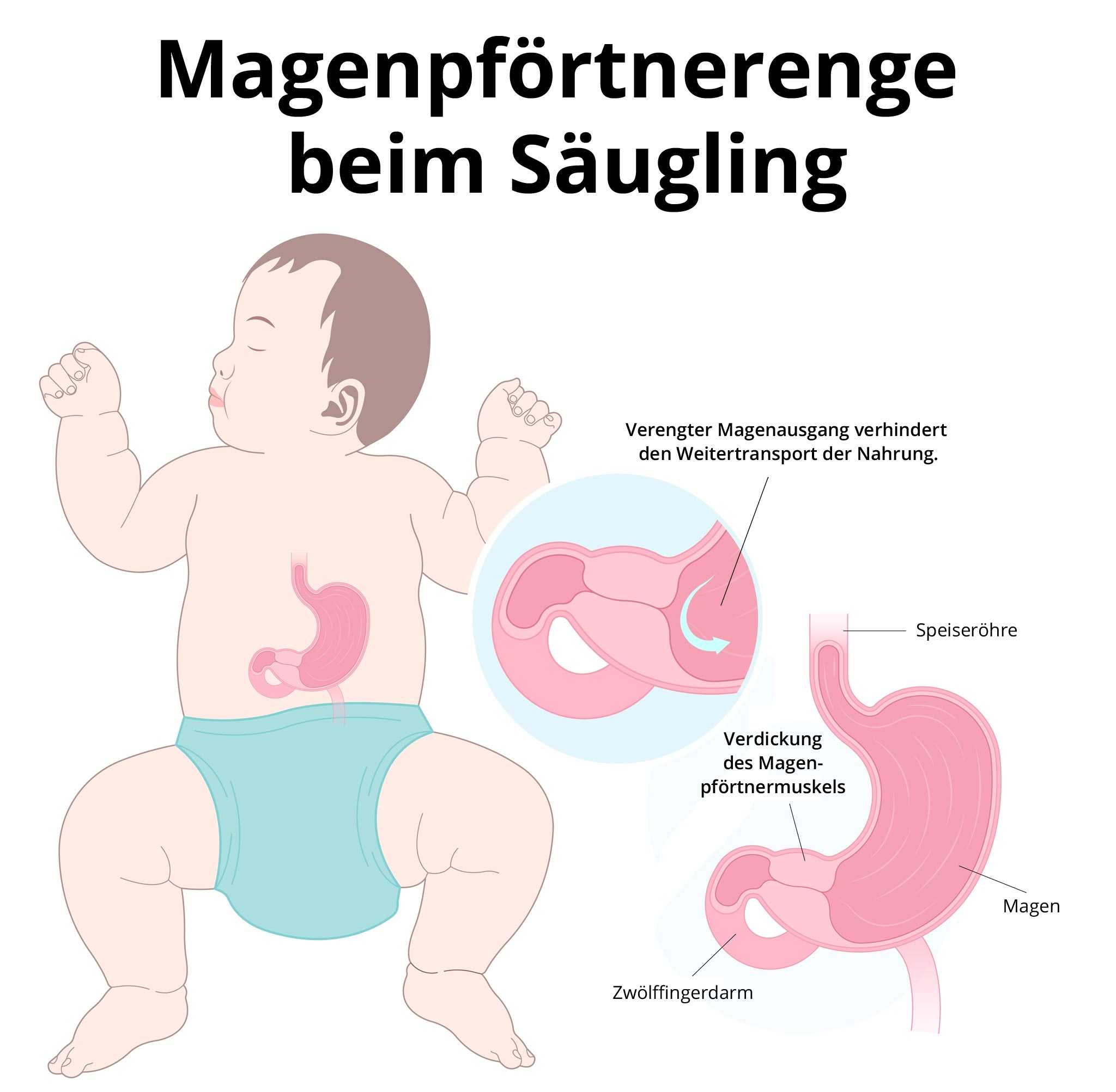 Jungen sind von der Magenentleerungsstörung wesentlich häufiger betroffen als Mädchen. Der Nahrungsbrei kann nicht ausreichend in den Zwölffingerdarm weiterbefördert werden. Die Symptome beginnen meist zwei Wochen bis einen Monat nach der Geburt. Der Säugling muss sich immer wieder übergeben.