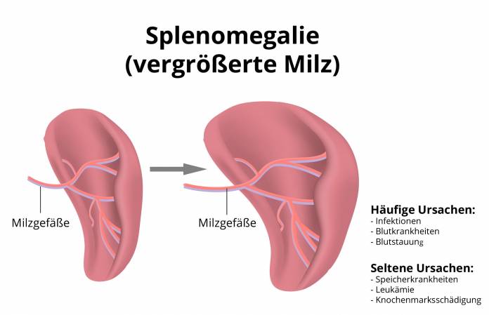 Die Vergrößerung der Milz ist selber keine Erkrankung, sondern ein Symptom, dass bei verschiedenen Erkrankungen auftritt. Der Grund dafür ist, dass sie durch verschiedenen Umstände mehr leisten muss. Bei Infektionserkrankungen werden der Abbau von Krankheitserregern und die Produktion von Immunzellen hochgefahren. Liegen Knochenmarkserkrankungen vor, übernimmt sie Teile der Blutbildung. Bluterkrankungen, die zu einem vermehrten Abbau oder zerstörten Blutzellen führen, erfordern die Mehrarbeit der Milz. Das führt zur Splenomegalie, also zur Vergrößerung der Milz