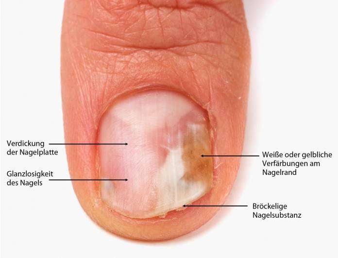 Durch den Pilzbefall werden die Nägel dick, rillig und rau. Sie wirken glanzlos, es kommt zur Ausbildung von Streifen und weißlich-gelblichen Färbungen. An den Nägeln kommt es zudem zu Abschilferungen bis hin zum bröckligen Zerfall der Nägel, wenn sie nicht frühzeitig behandelt werden.