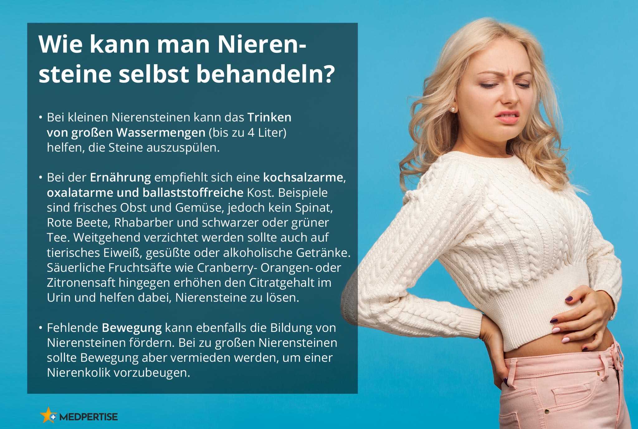 Die Entstehung von Nierensteinen kann verschiedenste Ursachen haben. Meist ist jedoch eine erhöhte Konzentration bestimmter Stoffe wie Calcium oder Oxalat im Urin dafür verantwortlich, dass sich kleine harte Kristalle bilden. Das geschieht insbesondere durch bestehenden Flüssigkeitsmangel. Wer immer wieder unter Nierensteinen leidet oder wen ein kleiner Nierenstein plagt, sollte reichlich Wasser trinken, um die Konzentration im Urin zu verdünnen und die Harnwege durchzuspülen. Empfohlen werden bei bestehenden Steinen bis zu 4 Liter täglich und ansonsten zur Vorbeugung wenigstens 1,5 Liter täglich.