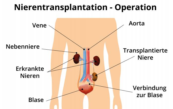 In der Regel wird die Spenderniere über einen seitlichen Unterbauchschnitt in den Unterbauch oberhalb der Leiste eingepflanzt. Dies hat gegenüber der Entfernung der eigenen Niere und der Einpflanzung der Spenderniere an gleicher Stelle den Vorteil, dass die Operation technisch einfacher ist, weniger Komplikationen auftreten und die transplantierte Niere für eventuelle spätere Eingriffe (z.B. Punktion) besser zugänglich ist.