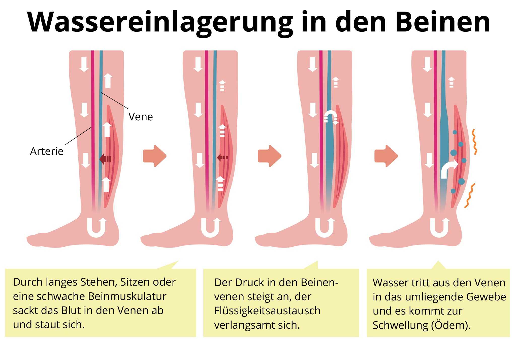 Der Entstehung von Ödemen liegt eine Störung im Flüssigkeitshaushalt oder im Gefäßsystem zugrunde. Im Normalfall fließt das mit Sauerstoff gesättigte, arterielle Blut über die Arterien in die feinen Kapillaren, die Kontakt zu den Körperzellen haben. Hier findet die Abgabe von Sauerstoff, Nährstoffen und Wasser statt. Das durch die Kapillaren fließende Blut nimmt das Kohlenstoffdioxid als Abfallprodukt aus den Zellen auf und transportiert es über die Venen zum Herzen und schließlich zur Lunge. Die aus den Kapillaren an die Umgebung abgegebene Flüssigkeit wird zum Teil über die Venen und zum Teil über die Lymphgefäße zum Herzen und damit in die Gefäße zurück transportiert.