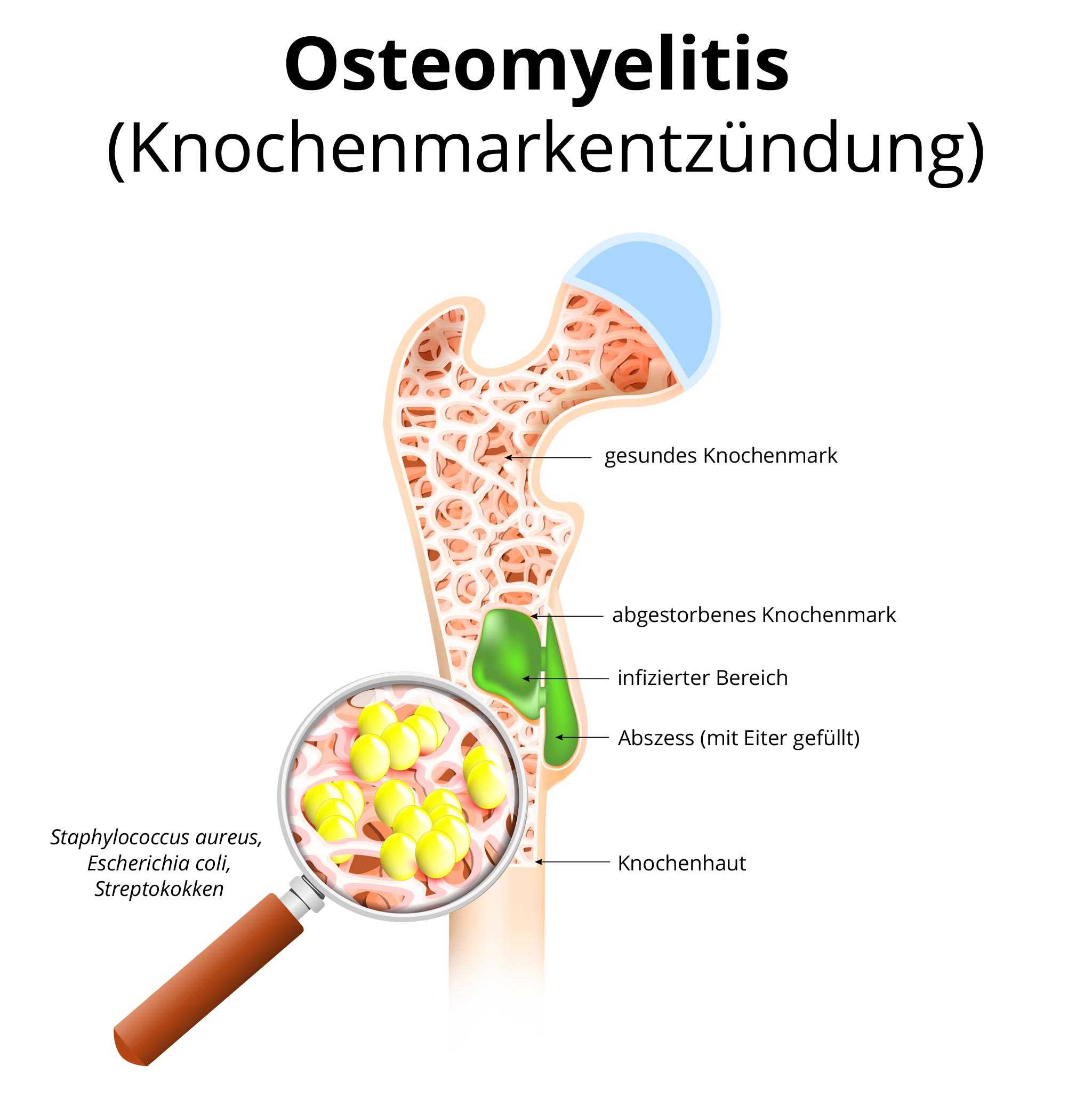 Der Begriff Osteomyelitis bezeichnet eine Entzündung des Knochenmarks. Diese Knochenmarkentzündung ist sehr oft nicht abzugrenzen von einer Knochenentzündung (Osteitis). Ein weiterer Ausdruck für die Entzündung wäre Knocheneiterung. Der Grund ist eine Infektion, meist mit Bakterien. Typischerweise geht eine offene Verletzung am Knochen der Infektion voraus. Manchmal entsteht die Osteomyelitis aber auch durch Streuung über das Blut. Zu den Symptomen gehören Schmerzen, Schwellung und teils auch Fieber. Mit Antibiotika und einer Ruhigstellung lassen sich diese Entzündungen oftmals erfolgreich behandeln. In bestimmten Fällen muss eine Operation stattfinden.