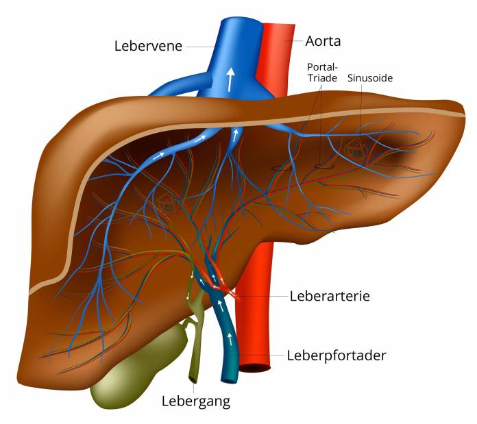 Dann kommt es zu den Auswirkungen der Blutstauung in der Pfortader.