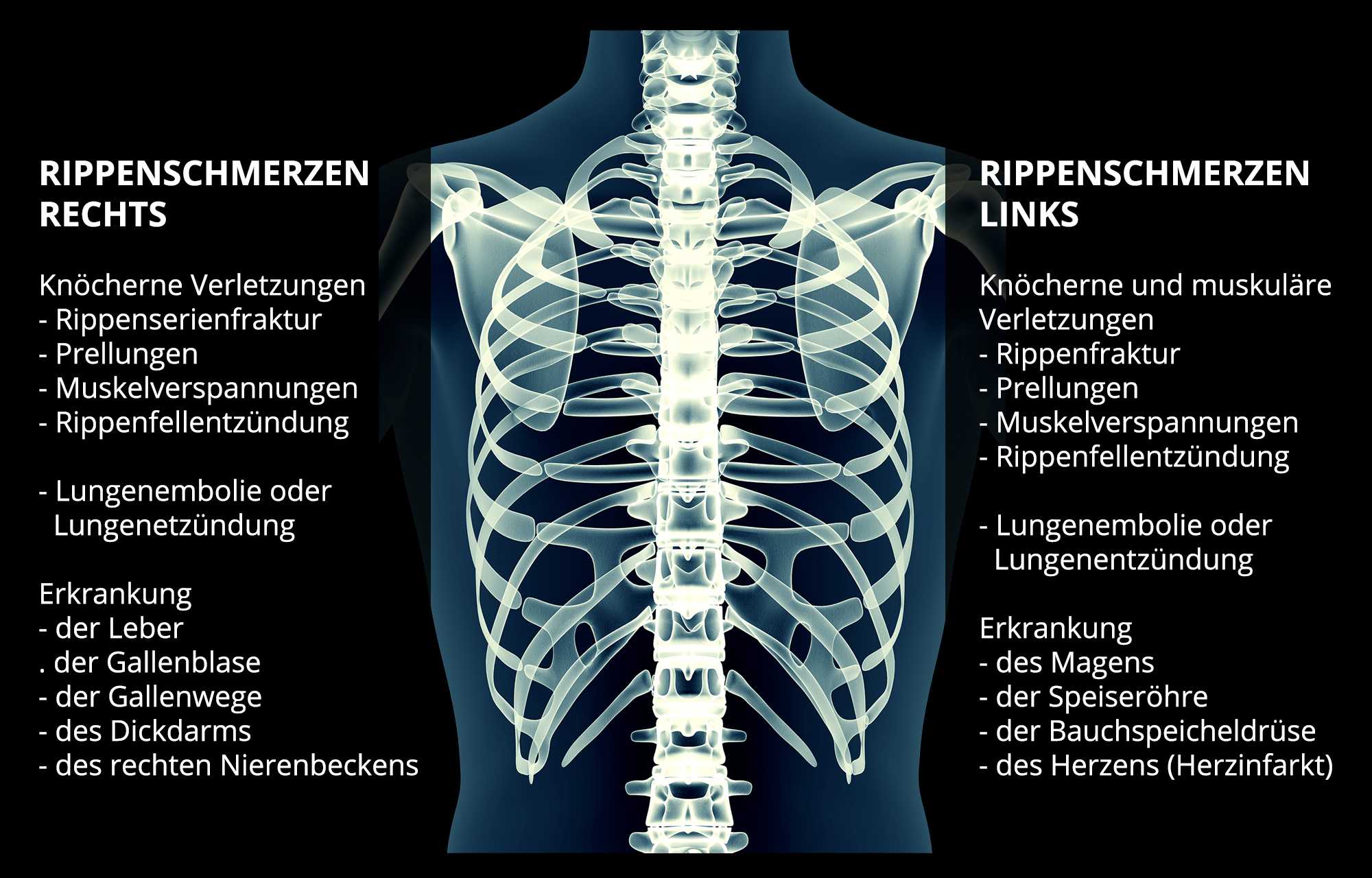 Die Rippenschmerzen können durch Verletzungen an der Rippe oder am benachbarten Gewebe verursacht werden, aber auch durch Entzündungen, andere Grunderkrankungen oder Krankheiten an inneren Organen. Das gesamte Beschwerdebild gibt Hinweise auf den Ursprung, eine sichere Diagnose lässt sich aber nur durch weitere Untersuchungen stellen.