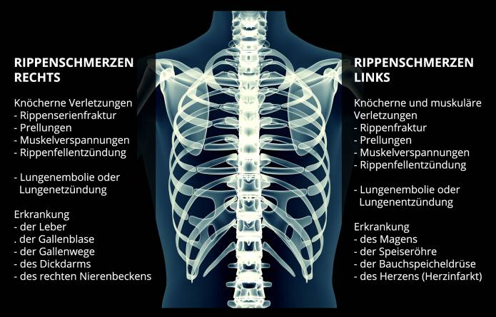 Werden die Schmerzen unmittelbar und an einer begrenzten Stelle in der Rippe verspürt, dann handelt es sich meist um eine Rippenprellung oder einen Rippenbruch. Meist ist eine entsprechende Einwirkung vorangegangen. Ein Schmerz in der Rippengegend, dessen Ort sich nicht deutlich ausmachen lässt und der von dumpfer Qualität ist, stammt hingegen eher aus dem Körperinneren. Hier können Organe wie Herz, Lunge oder Leber ein Warnsignal senden. Schmerzen können auch zwischen den Rippen auftreten. In diesem Fall liegt oft eine Nervenreizung oder eine Beanspruchung der Muskulatur vor.
