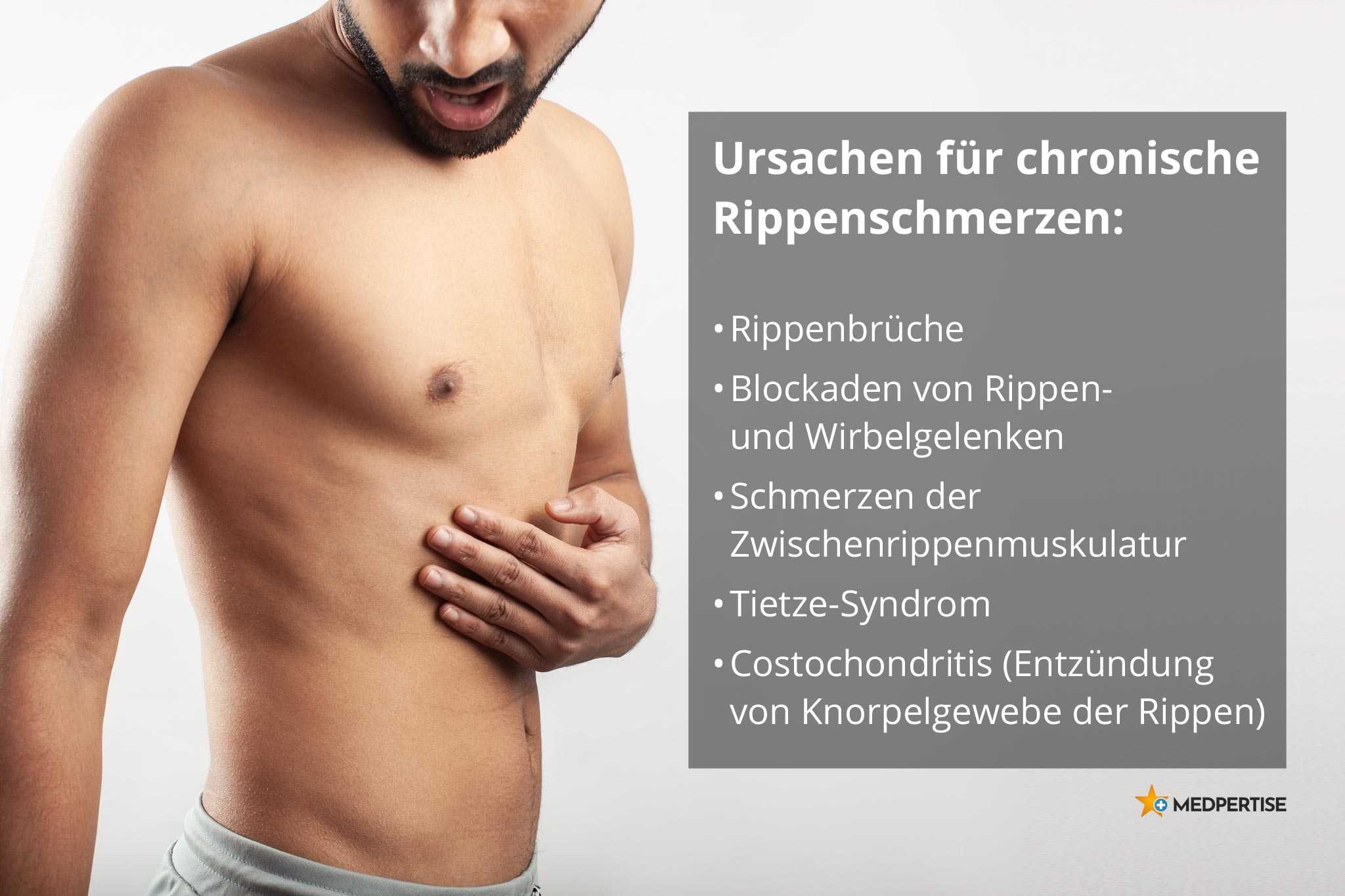 Zahlreiche Erkrankungen innerer Organe können Rippenschmerzen verursachen. Wenn diese Erkrankungen nicht erkannt werden oder nicht geheilt werden können, ist es möglich, dass die Schmerzen chronisch werden. Mögliche betroffene Organe sind: