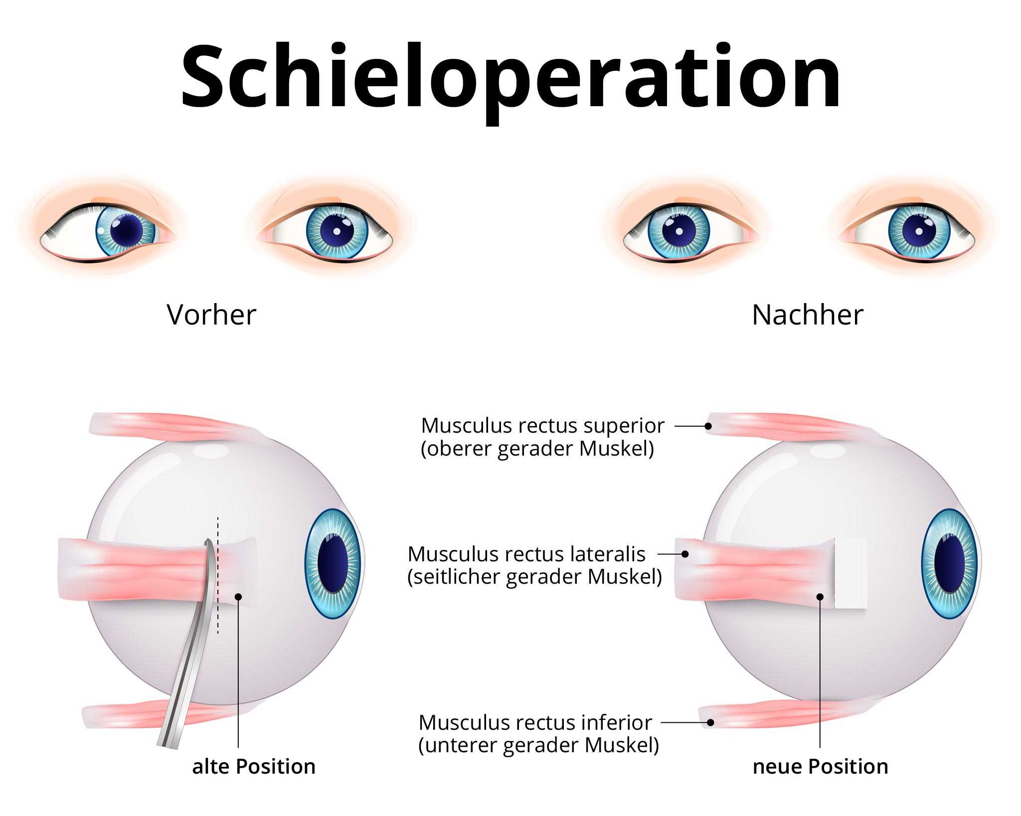 Je nach der Richtung des Schielens können ein oder mehrere Augenmuskeln verkürzt oder verlängert werden. Ebenfalls kann die Ansatzstelle des Muskels versetzt werden, um einen funktionell kürzeren oder längeren Muskel zu erhalten. Meist werden die Muskeln an einem der Augen operiert, bisweilen auch an beiden Augen. Der Augapfel selbst muss bei der Schieloperation nicht eröffnet werden.
