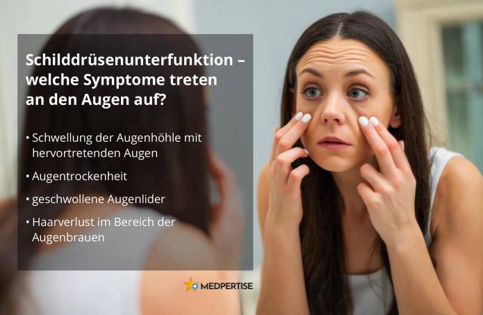 Die Schilddrüsenunterfunktion (Hypothyreose) kann zu vielfältigen Veränderungen des menschlichen Organismus führen. Diese können von ausgeprägter Müdigkeit über ein erhöhtes Körpergewicht bis hin zu Haarausfall reichen. Eine Erkrankung der Augen im Rahmen einer Schilddrüsenunterfunktion ist selten. Möglich sind eine Schwellung der Augenhöhle mit hervortretenden Augen (endokrine Orbitopathie) oder eine Augentrockenheit. Außerdem kann eine Schilddrüsenunterfunktion zu Lidschwellungen durch Wassereinlagerungen (Ödemen) oder zu einem Haarverlust führen, der am äußeren Bereich der Augenbrauen auffällig werden kann.