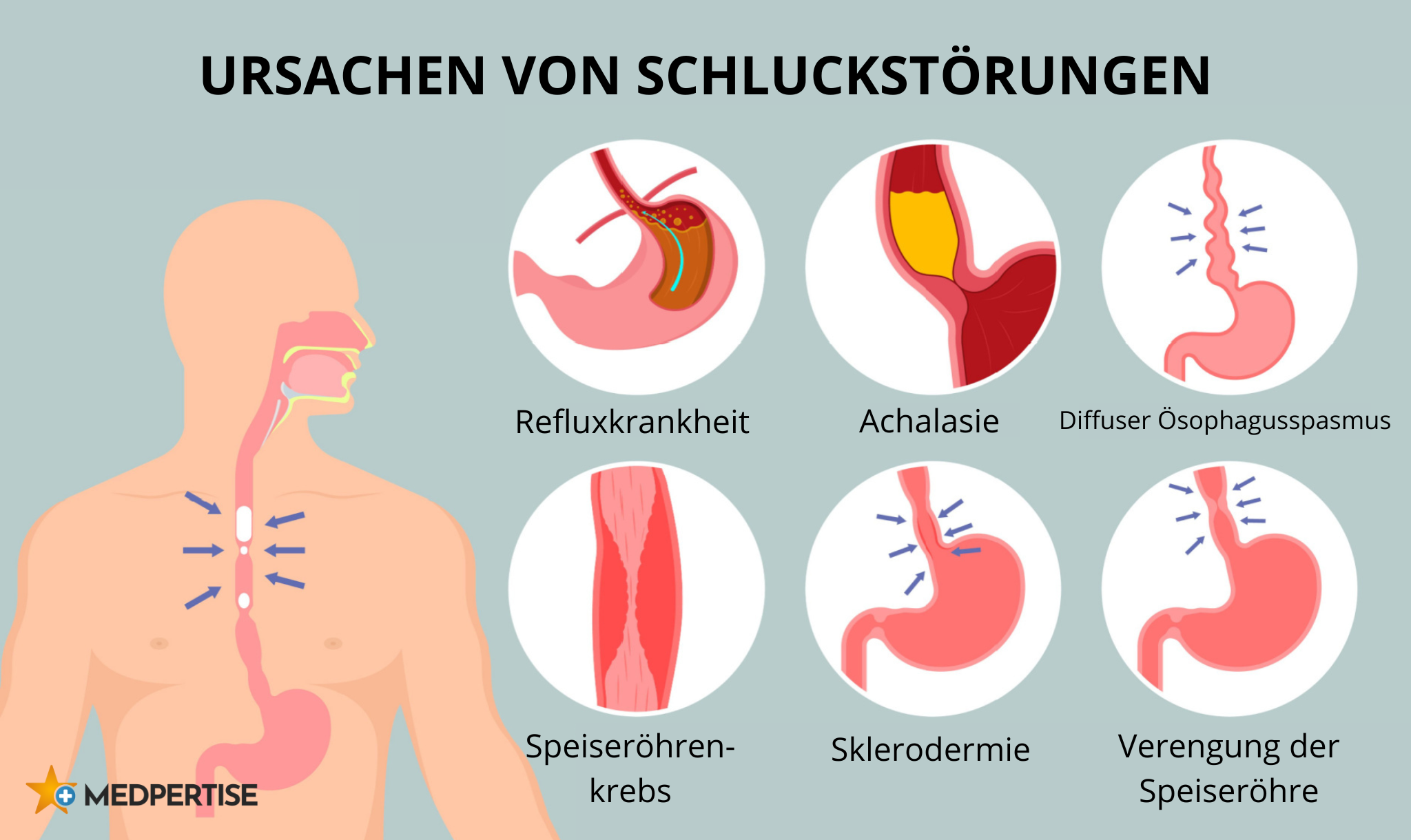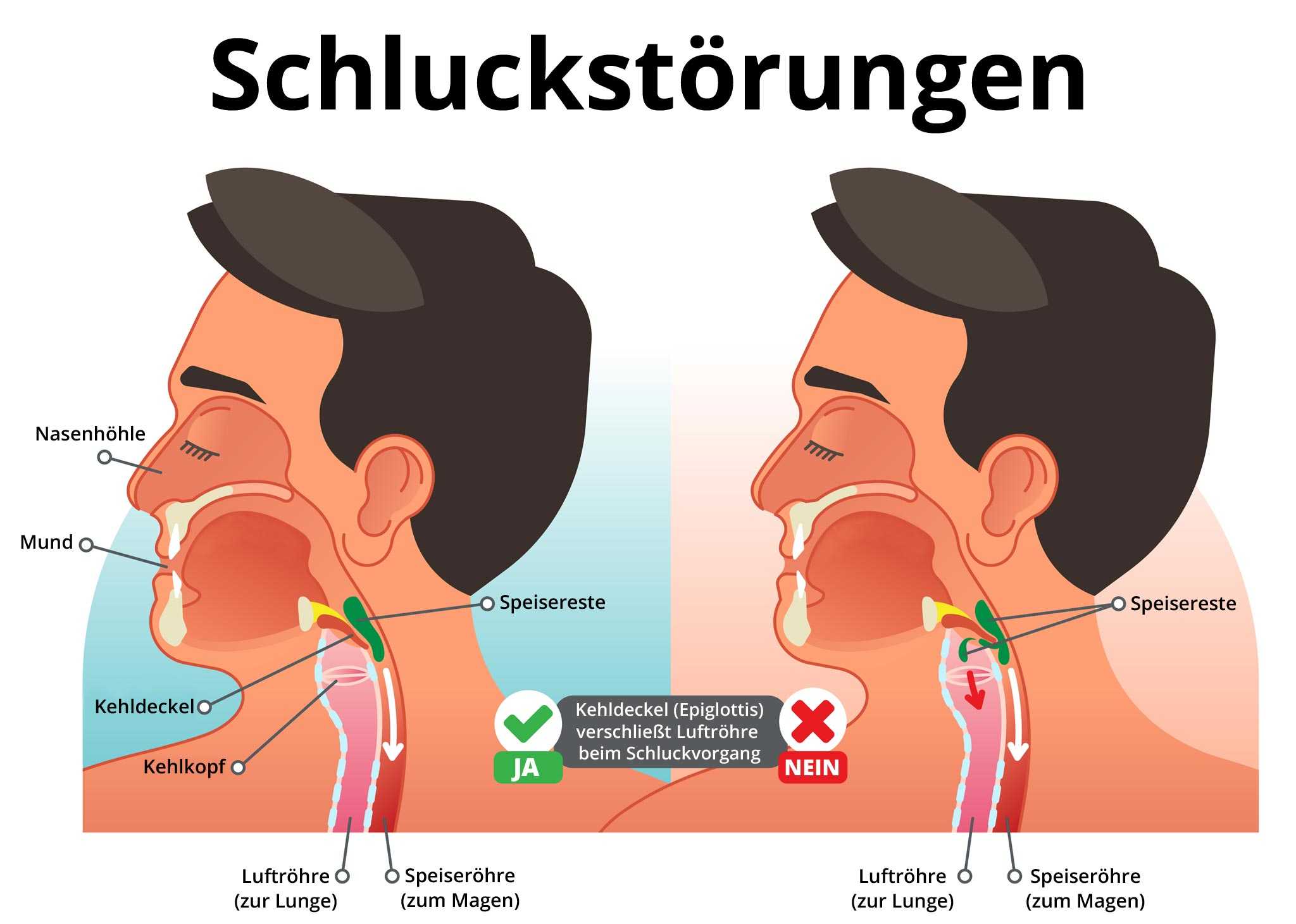Der Schluckakt ist ein komplexer Vorgang, der nur durch das fein abgestimmte Zusammenspiel vieler Muskeln und Nerven geregelt ablaufen kann. Wichtig dabei sind insbesondere Kaumuskeln, Zunge, Rachen, Kehlkopf und Speiseröhre, die durch ein Netzwerk von Nerven und Reflexen gesteuert werden. Sind bestimmte Teile des Systems eingeschränkt oder ausgefallen, so kommt es beim Essen oder Trinken zu Schluckstörungen, Schmerzen oder dem Verschlucken (Aspirieren) von Speiseresten.