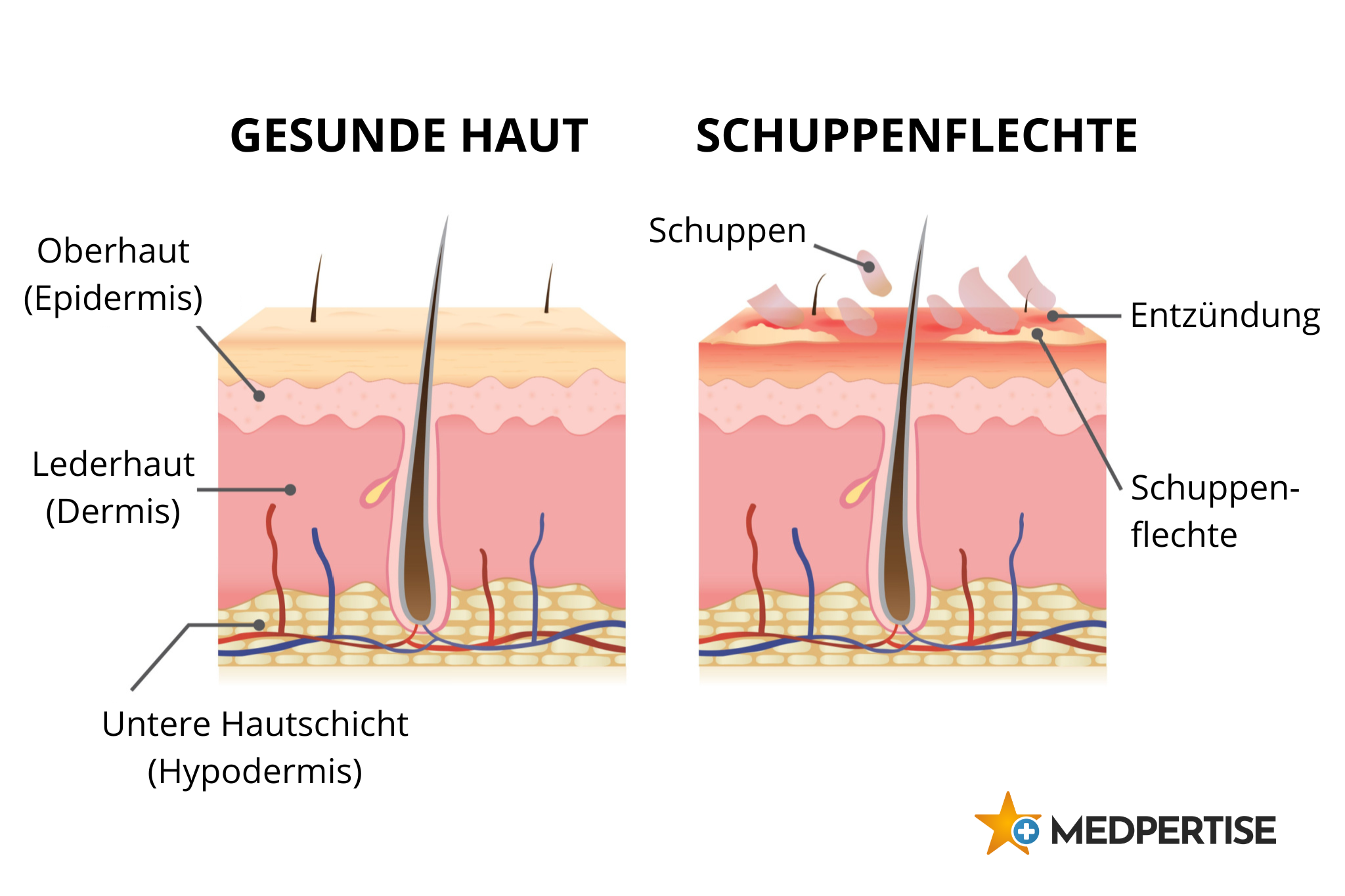 Die Schuppenflechte gilt als eine Autoimmunkrankheit. Eine Autoimmunkrankheit ist ein Leiden, das durch eine Reaktion des Immunsystems auf körpereigenes Gewebe entsteht. Bei der Schuppenflechte registrieren bestimmte Zellen, die T-Lymphozyten, Anteile vom Oberhautgewebe als vermeintlich fremd. Es kommt dann zur Freisetzung körpereigener Substanzen (Botenstoffe), die entzündliche Vorgänge auslösen. An der Oberhaut findet eine verstärkte Teilung der Hornzellen (Keratinozyten) statt, so dass es zu den charakteristischen Befunden mit Schuppenbildung kommt.