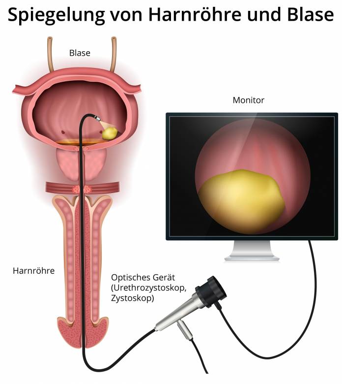 Der Arzt beurteilt dann die Harnröhre und Blase nach krankhaften Veränderungen. Es kann auch eine Probeentnahme von Gewebe (Biopsie) durchgeführt werden. Das entnommene Gewebe wird dann einer feingeweblichen Untersuchung (Histologie) zugeführt. Manchmal wird auch Kontrastmittel für eine Röntgenuntersuchung über eine Spiegelung eingespritzt.