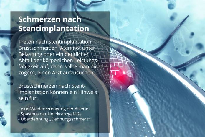 Einige Patienten berichten auch nach der Stentimplantation über Brustschmerzen. In einer Studie wurden 57 Patienten, die sich einer Stentimplantation unterziehen mussten, untersucht. 15 dieser Patienten klagten nach dem Eingriff über Brustschmerzen. Bei einigen Patienten kam es zu einer In-Stent-Restenose, also einer Wiederverengung der Arterie. Diese muss erneut behandelt werden. Nicht bei allen Patienten ist das Auftreten der Beschwerden mit einer Wiederverengung der Arterie zu erklären, sondern dadurch, dass die Gefäße reaktiver sind. Das heißt, sie können sich stärker zusammen ziehen und verursachen dadurch die Schmerzen (Koronararterienspasmus). Diese Beschwerden haben einen gutartigen Charakter, sind aber für Betroffene dennoch störend und müssen von Ärzten genau so ernst genommen werden. Weiterhin können die Beschwerden durch eine Überdehnung ausgelöst werden. Dies wird als "Dehnungsschmerz" bezeichnet.
