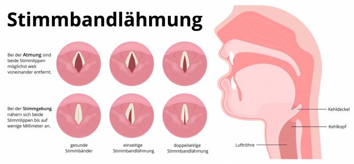 Um die Folgen einer Stimmbandlähmung zu verstehen, muss man die Funktion der beiden Stimmbänder oder Stimmlippen kennen. Für eine klare Stimme (ohne Heiserkeit) ist es notwendig, dass die beiden Stimmlippen sich bis auf wenige Millimeter annähern. Für die ungestörte Atmung müssen sich die beiden Stimmlippen möglichst weit voneinander entfernen, um genug Luft zwischendurch zu lassen.