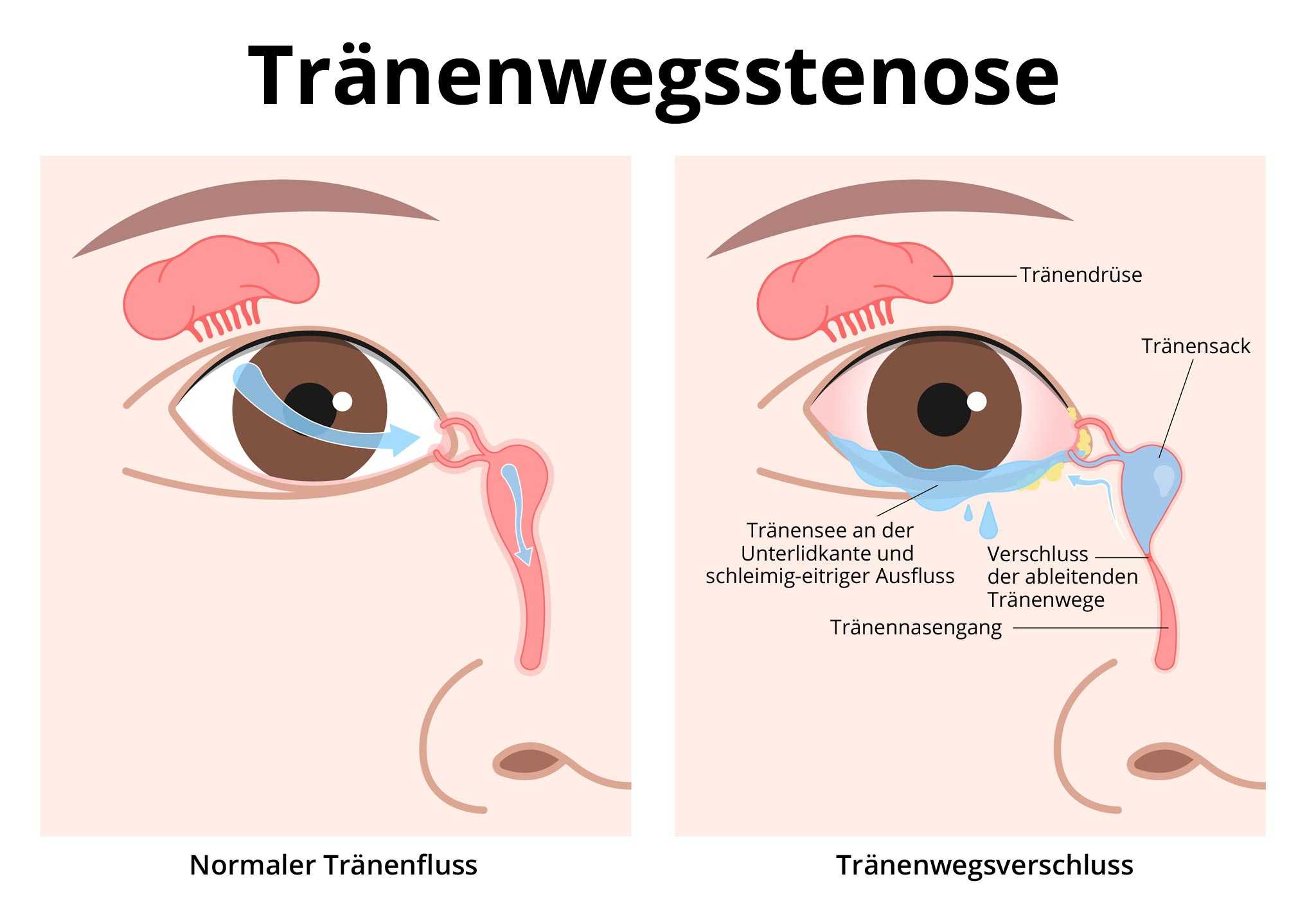 Wenn die Tränenwege verengt oder verlegt sind, dann spricht der Mediziner von einer Tränenwegsstenose. Diese Erkrankung beeinträchtigt den Abfluss der Tränenflüssigkeit vom Auge. Das Auge tränt stark. Das ist den Betroffenen lästig. Weitere Folgen wie Entzündungen (unter anderem auch Tränensackentzündung), verwässertes Sehen durch den Tränenfilm oder sogar ein verzogenes Augenlid wegen ständigen Wischens sind möglich. Eine Operation der Tränenwege kann notwendig werden.
