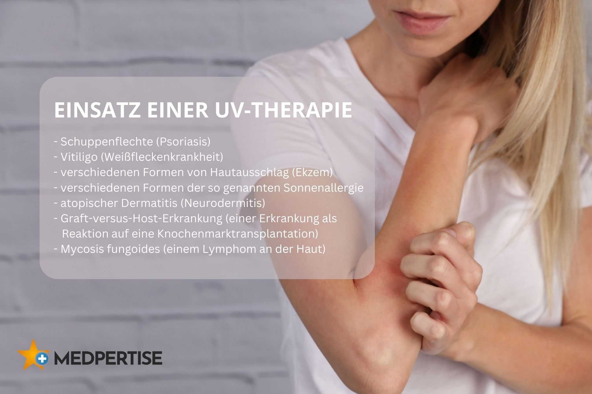 Die UV-Therapie kann in Form einer Phototherapie oder Photochemotherapie bei vielen Hautkrankheiten zum Einsatz kommen. Vor allem bei chronischen Erkrankungen ist sie sinnvoll. Häufig eignet sie sich bei: