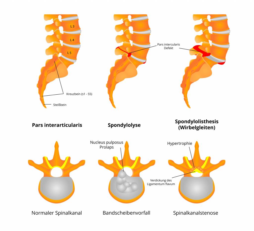 Man unterscheidet zwei Formen der Spondylolisthesis. Bei der „echten" Spondylolisthesis, die im Kindes- und Jugendalter auftritt, kommt es zu einer Lösung des Wirbelbogens vom Wirbelkörper (Spondylolyse). Sie tritt fast immer am fünften, also untersten Lendenwirbel auf. Eine solche Spondylolyse als Ursache für ein Wirbelkörpergleiten tritt gehäuft bei Kindern und Jugendlichen auf, die sehr früh mit einem Leistungssport begonnen haben, der eine extreme Beweglichkeit erfordert. Zu diesen Sportarten gehören Turnen, Akrobatik oder auch Trampolinspringen.